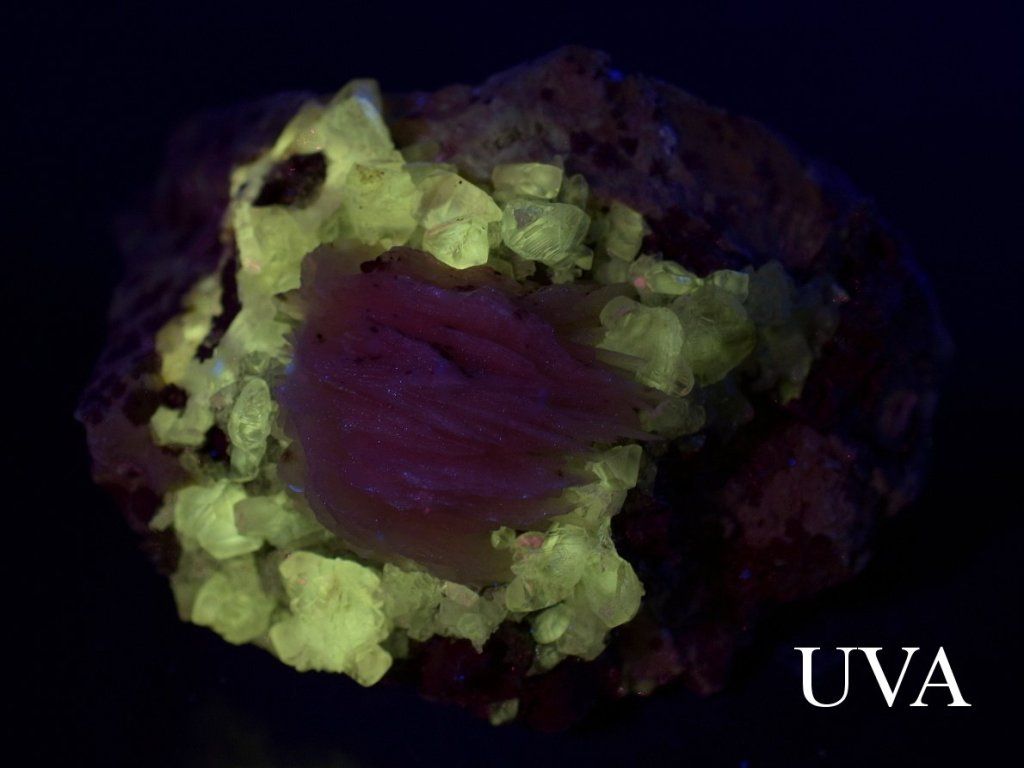 Velmi jasně svítící růžové body, které jsou na fotografii (UVA) místy viditelné, nejsou přirozenou fluorescencí žádného z minerálu – jedná se o odlesky UV LED zdroje, které se projevují pouze na fotografii a při běžném pozorování nejsou patrné.