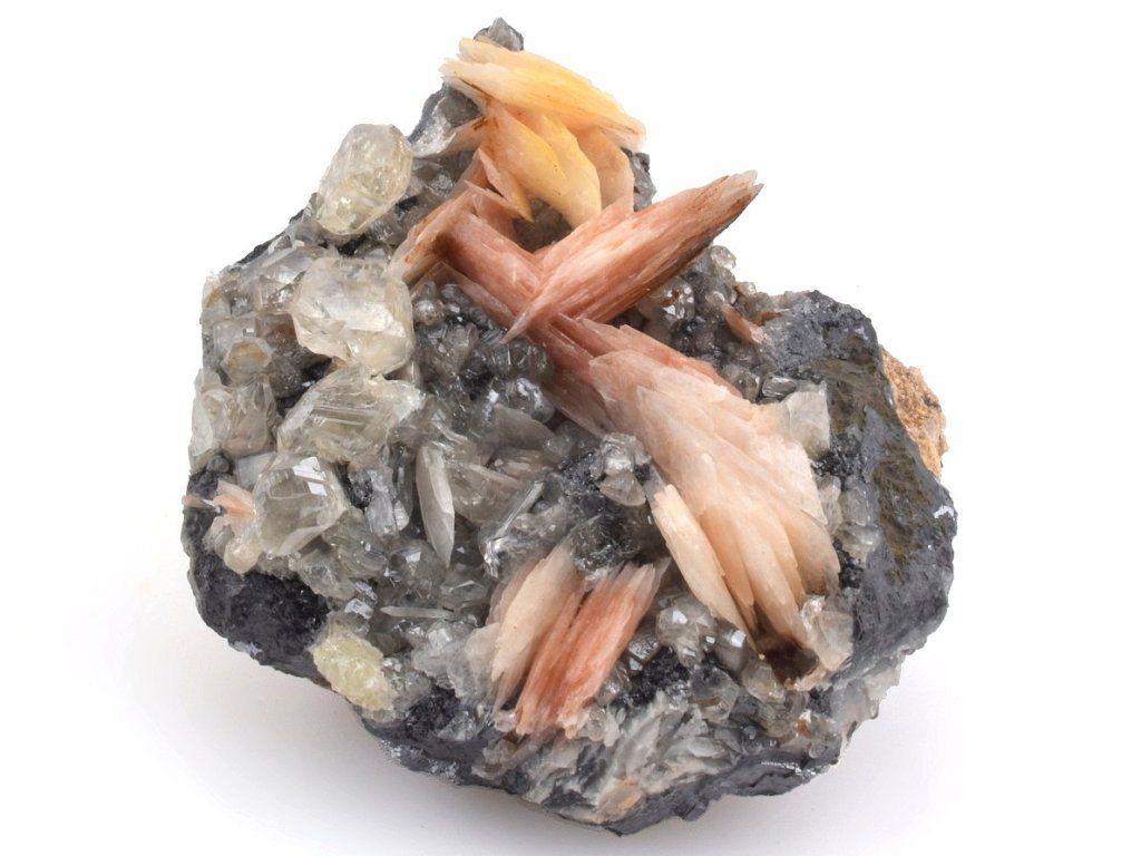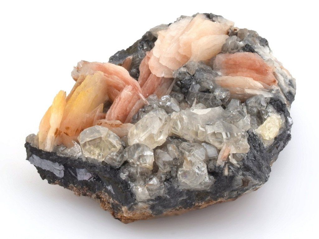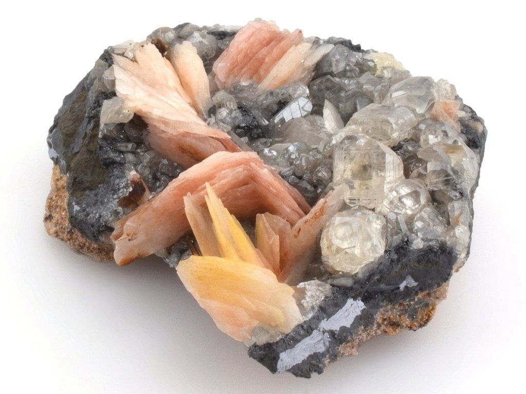 Světlé krystaly cerusitu narůstajících na šedočerném galenitu, doplněná lupenitými krystaly barytu v jemných růžovo-oranžových odstínech.