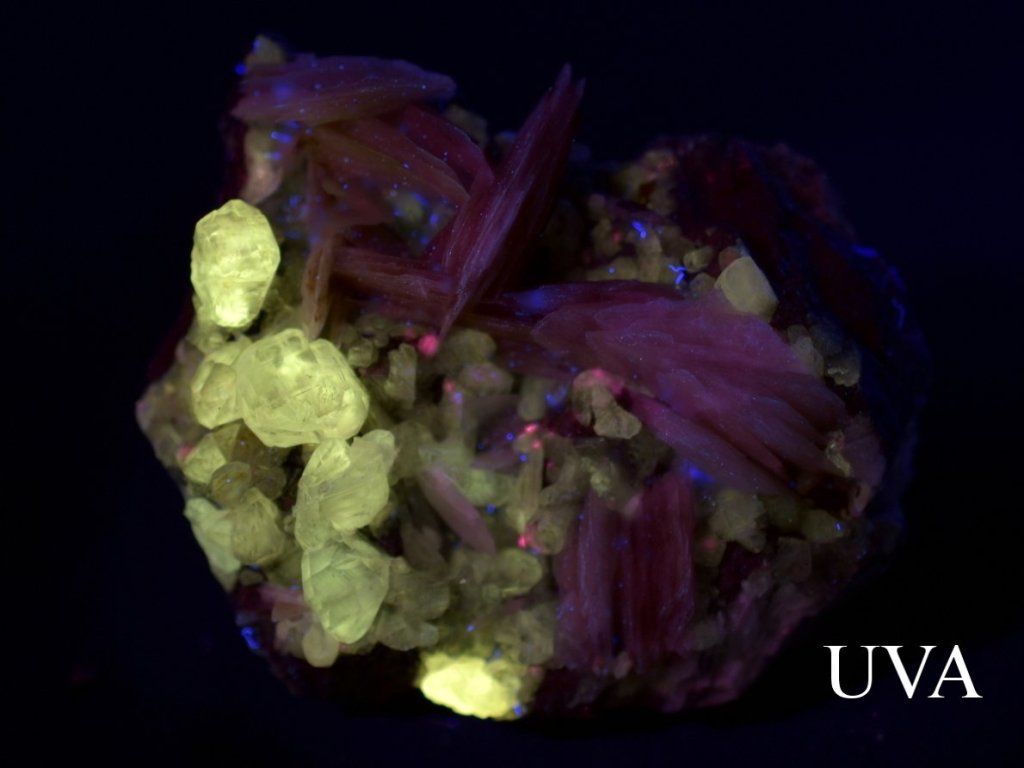 Na fotografii označené UVA je minerál nasvícen dlouhovlnným ultrafialovým světlem a jsou zde patrné následující efekty:
