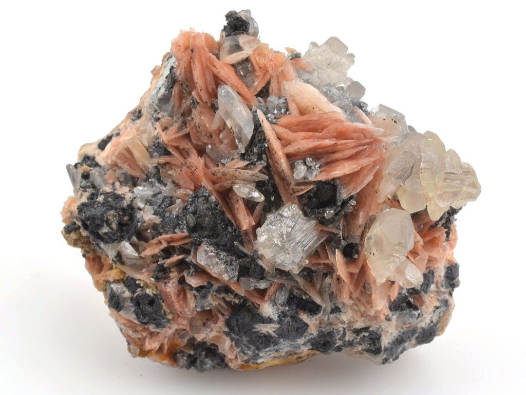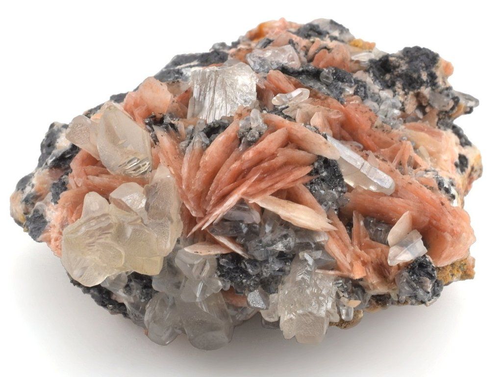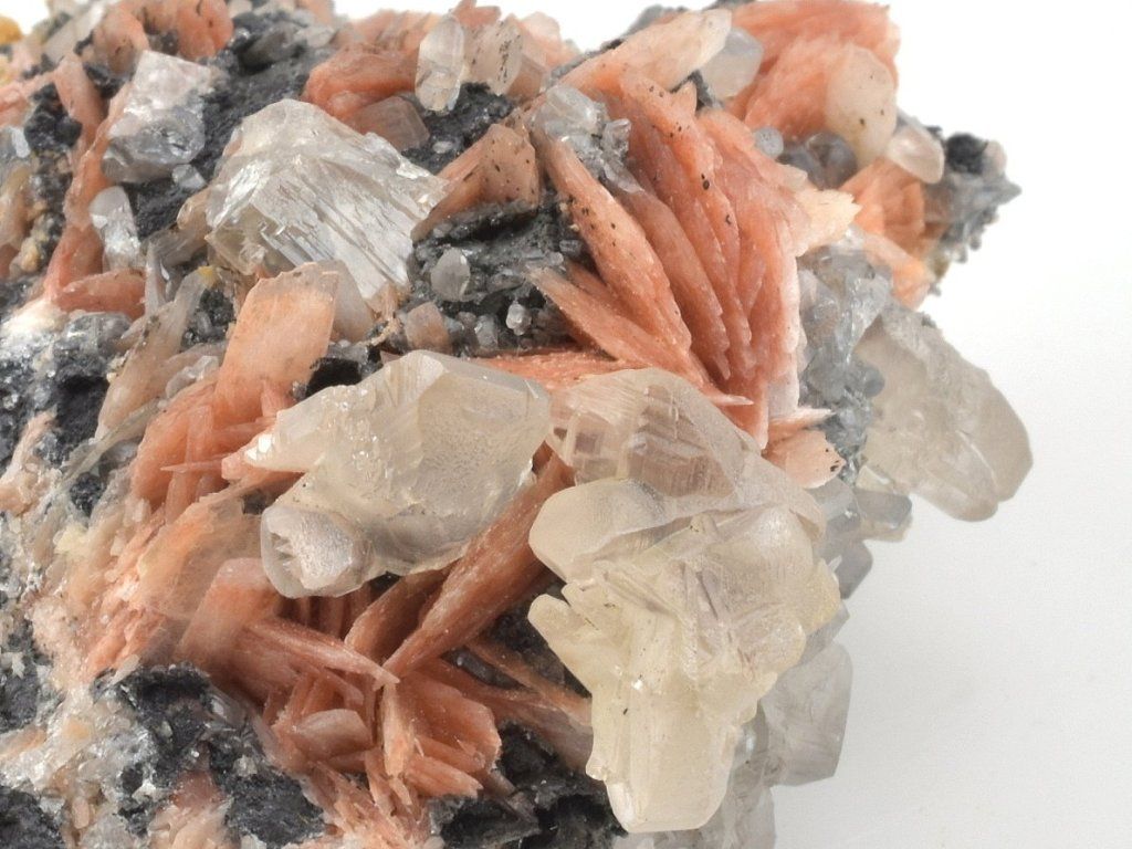 Bohatá drúza světlých krystalů cerusitu narůstajících na šedočerném galenitu, doplněná estetickými lupenitými krystaly barytu v jemných růžovo-oranžových odstínech.