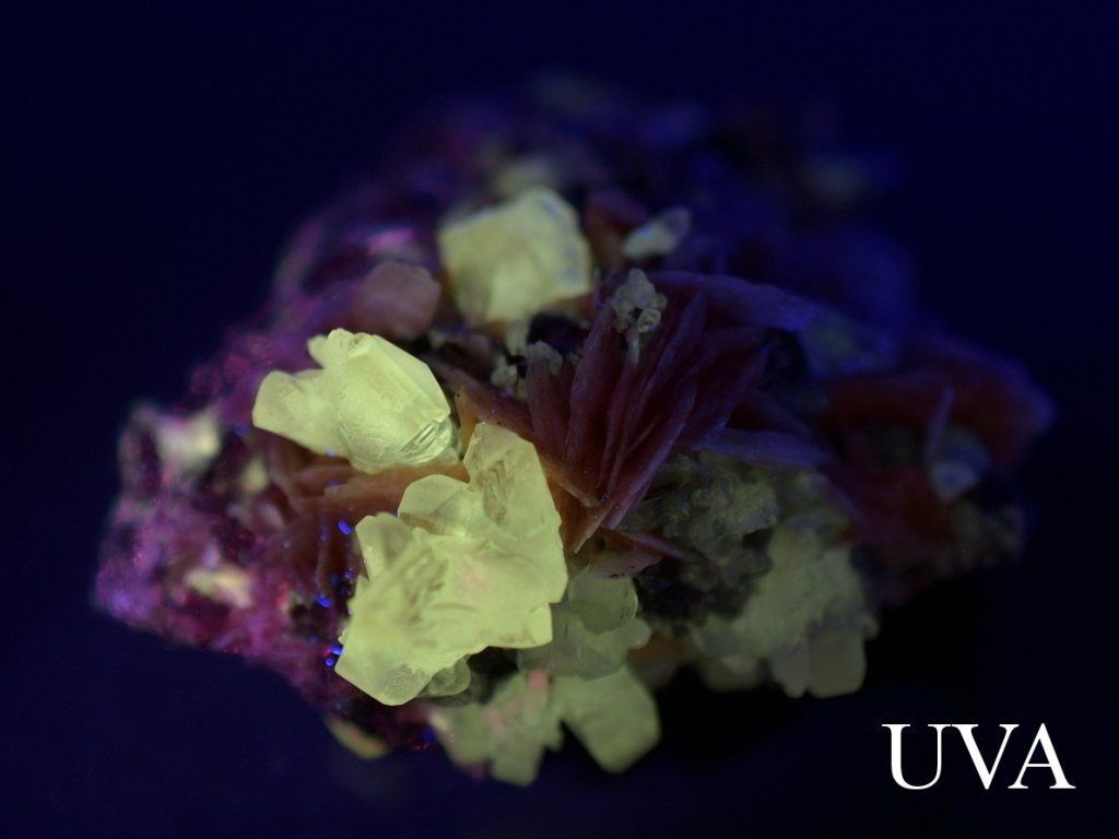 Na fotografii označené UVA je minerál nasvícen dlouhovlnným ultrafialovým světlem a jsou zde patrné následující efekty: