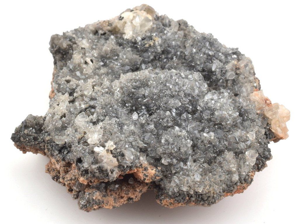 Světlé krystaly cerusitu narůstajících na šedočerném galenitu.