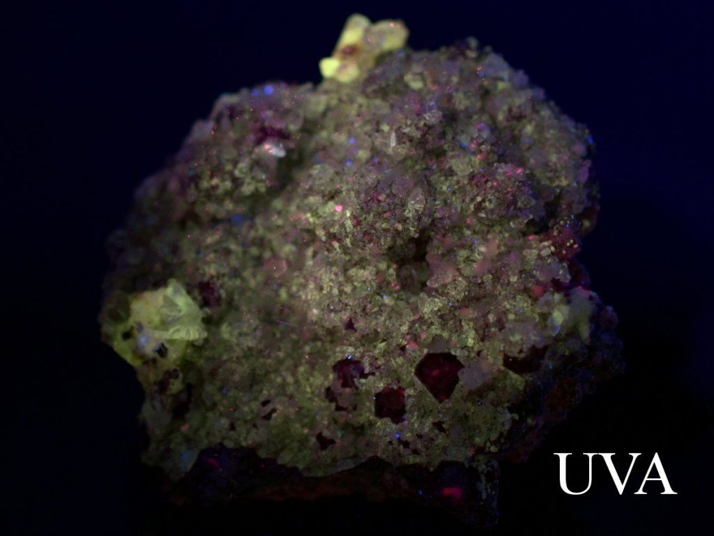 Velmi jasně svítící růžové body, které jsou na fotografii (UVA) místy viditelné, nejsou přirozenou fluorescencí žádného z minerálu – jedná se o odlesky UV LED zdroje, které se projevují pouze na fotografii a při běžném pozorování nejsou patrné.