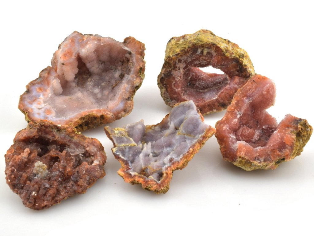 Zbarvení těchto achátových geod je pro tuto oblast velmi charakteristické – typický je růžový vnější okraj a načervenalé až hnědočervené odstíny způsobené přítomností hematitu. Vnější lem dutin bývá často tvořen růžovým opálem a na chalcedonu uvnitř se místy vykrystalizují jemné krystaly křišťálu. Vyskytují se zde také typické chalcedonové růže v růžových, načervenalých, fialových i šedobílých odstínech.