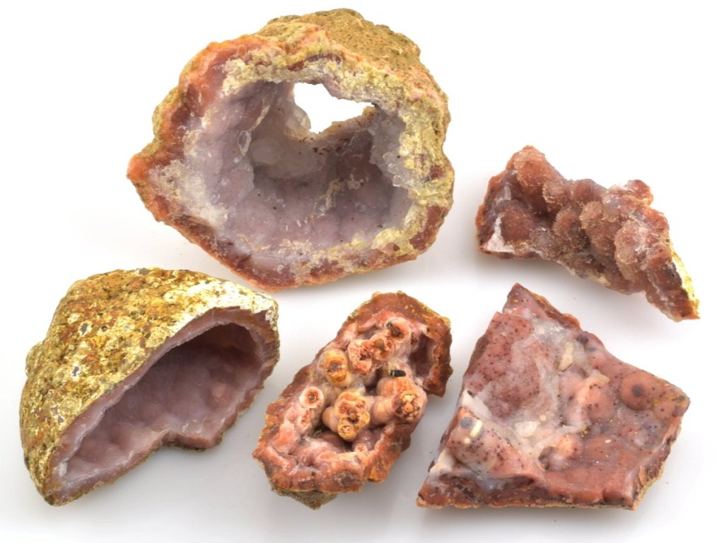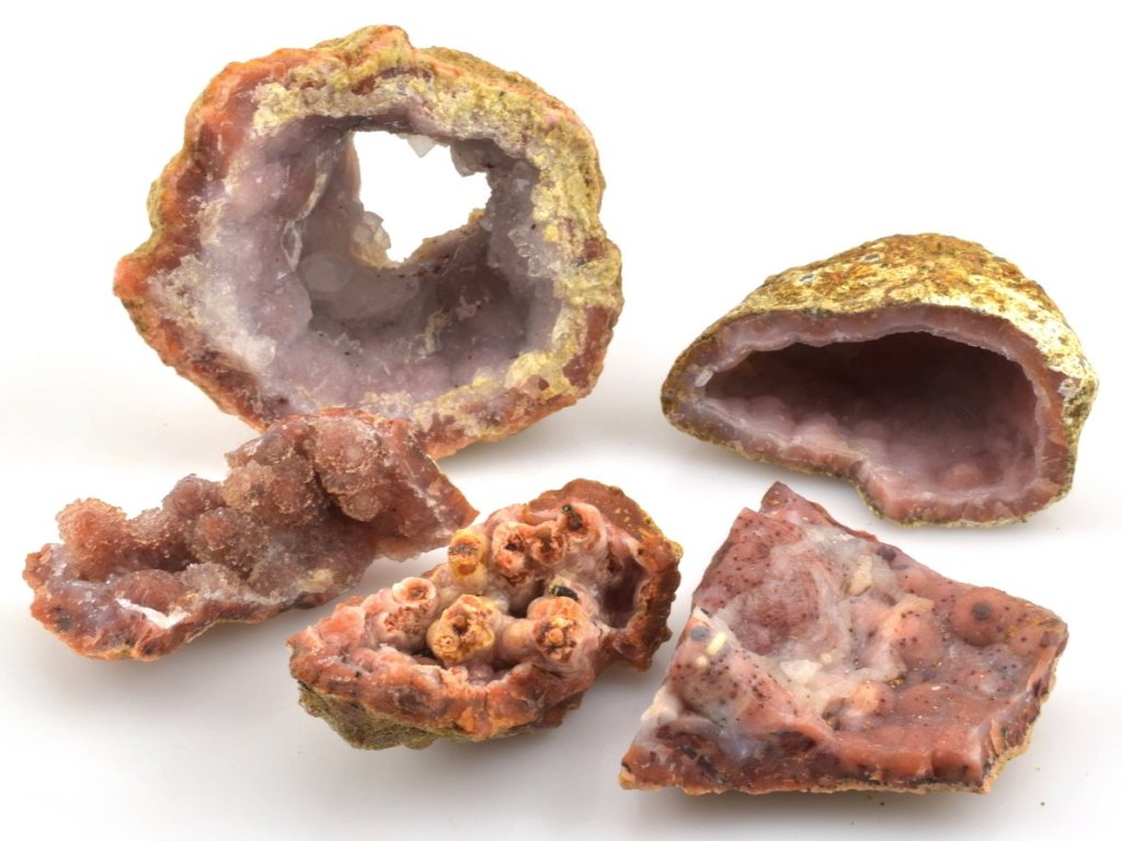 Zbarvení těchto achátových geod je pro tuto oblast velmi charakteristické – typický je růžový vnější okraj a načervenalé až hnědočervené odstíny způsobené přítomností hematitu. Vnější lem dutin bývá často tvořen růžovým opálem a na chalcedonu uvnitř se místy vykrystalizují jemné krystaly křišťálu. Vyskytují se zde také typické chalcedonové růže v růžových, načervenalých, fialových i šedobílých odstínech.
