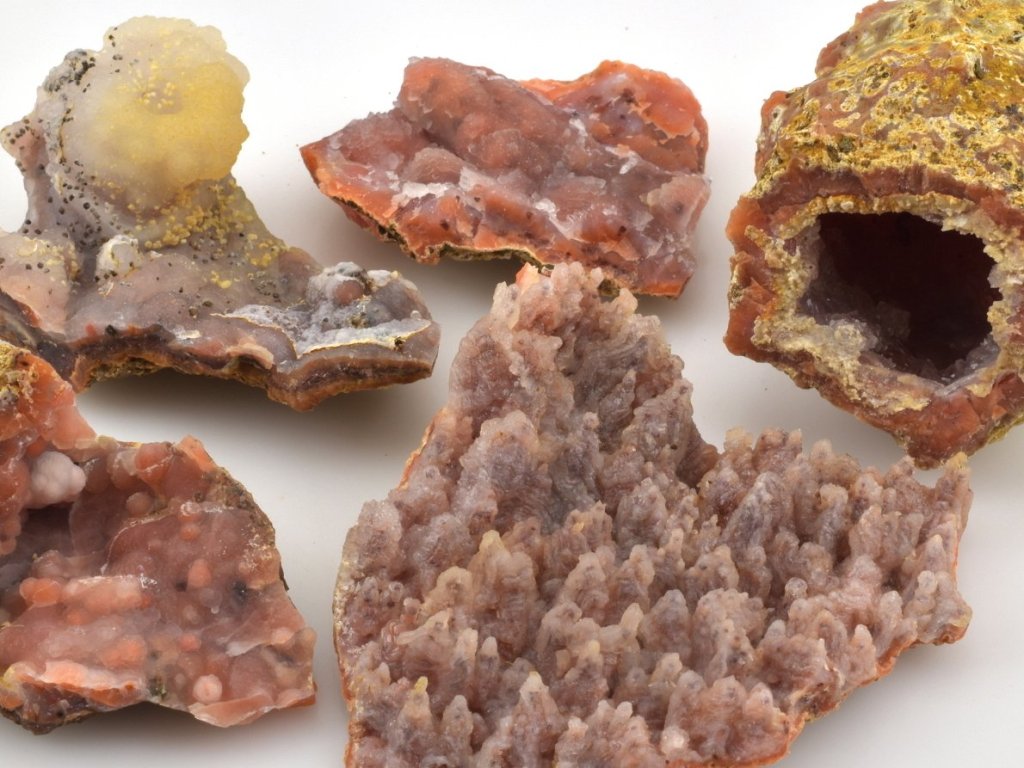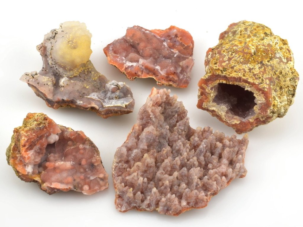 Zbarvení těchto achátových geod je pro tuto oblast velmi charakteristické – typický je růžový vnější okraj a načervenalé až hnědočervené odstíny způsobené přítomností hematitu. Vnější lem dutin bývá často tvořen růžovým opálem a na chalcedonu uvnitř se místy vykrystalizují jemné krystaly křišťálu. Vyskytují se zde také typické chalcedonové růže v růžových, načervenalých, fialových i šedobílých odstínech.