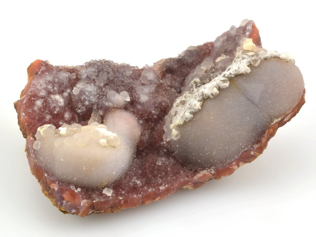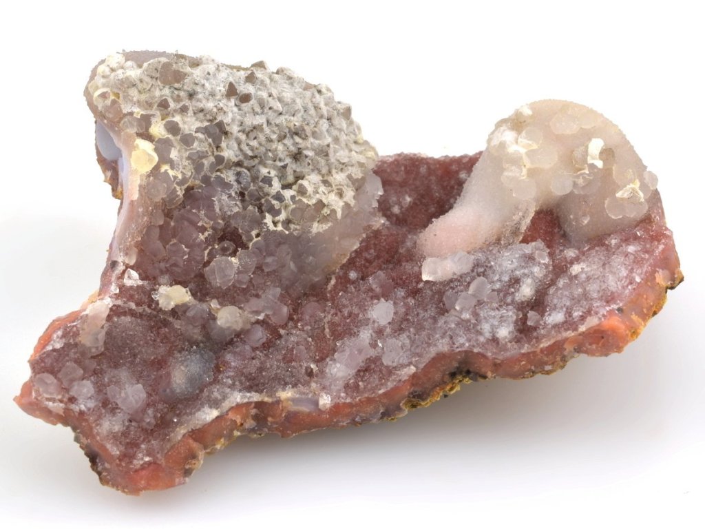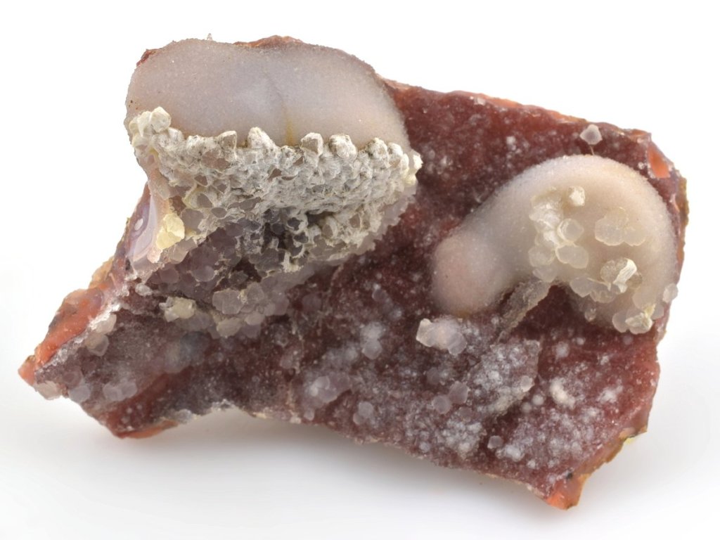 Zbarvení těchto achátových geod je pro tuto oblast velmi charakteristické – typický je růžový vnější okraj a načervenalé až hnědočervené odstíny způsobené přítomností hematitu. Vnější lem dutin bývá často tvořen růžovým opálem a na chalcedonu uvnitř se místy vykrystalizují jemné krystaly křišťálu. Vyskytují se zde také typické chalcedonové růže v růžových, načervenalých, fialových i šedobílých odstínech.