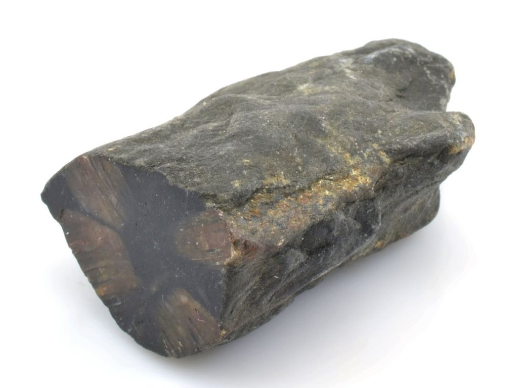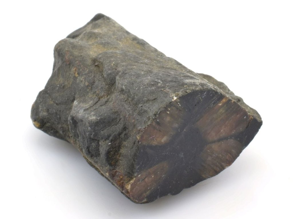 Prodej leštěného příčného řezu krystalem chiastolitu. Sloupečkovitý krystal chiastolitu je s viditelným černým křížem, který vzniká přirozeným uspořádáním grafitu uvnitř minerálu. Krystal je skvělým sbírkovým vzorkem.