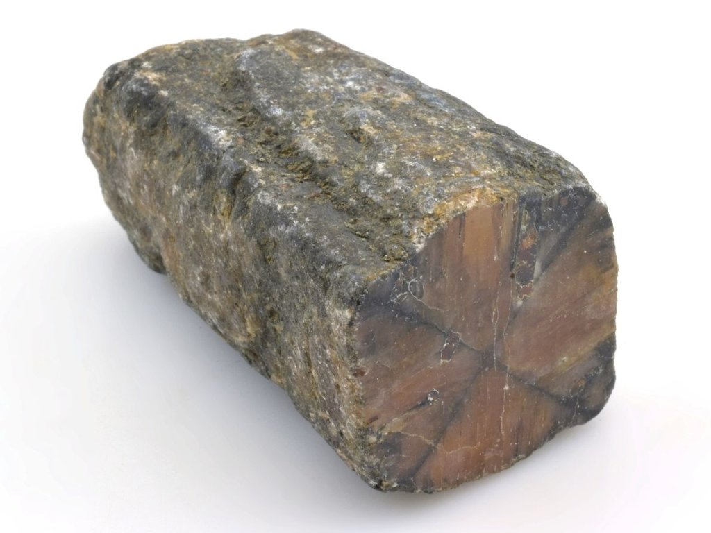 Prodej leštěného příčného řezu krystalem chiastolitu. Sloupečkovitý krystal chiastolitu je s viditelným černým křížem, který vzniká přirozeným uspořádáním grafitu uvnitř minerálu. Krystal je skvělým sbírkovým vzorkem.