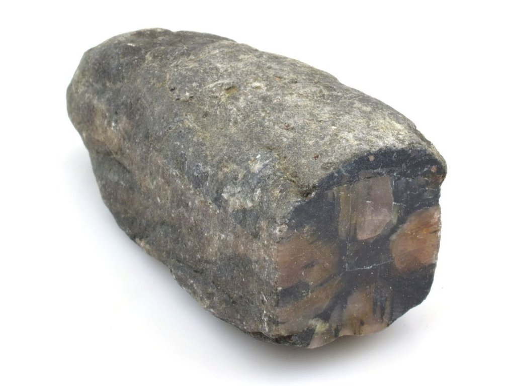 Prodej leštěného příčného řezu krystalem chiastolitu. Sloupečkovitý krystal chiastolitu je s viditelným černým křížem, který vzniká přirozeným uspořádáním grafitu uvnitř minerálu. Krystal je skvělým sbírkovým vzorkem.