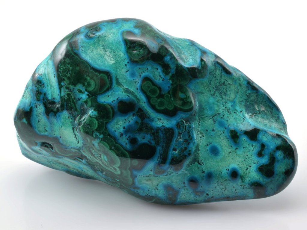 Jedinečný leštěný vzorek chryzokolu a malachitu z proslulého naleziště u města Lubumbashi (DR Kongo), který zaujme na první pohled svou dramatickou hrou barev.