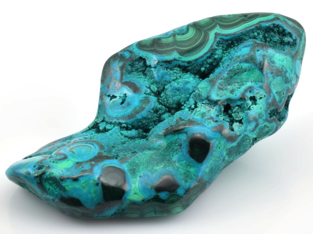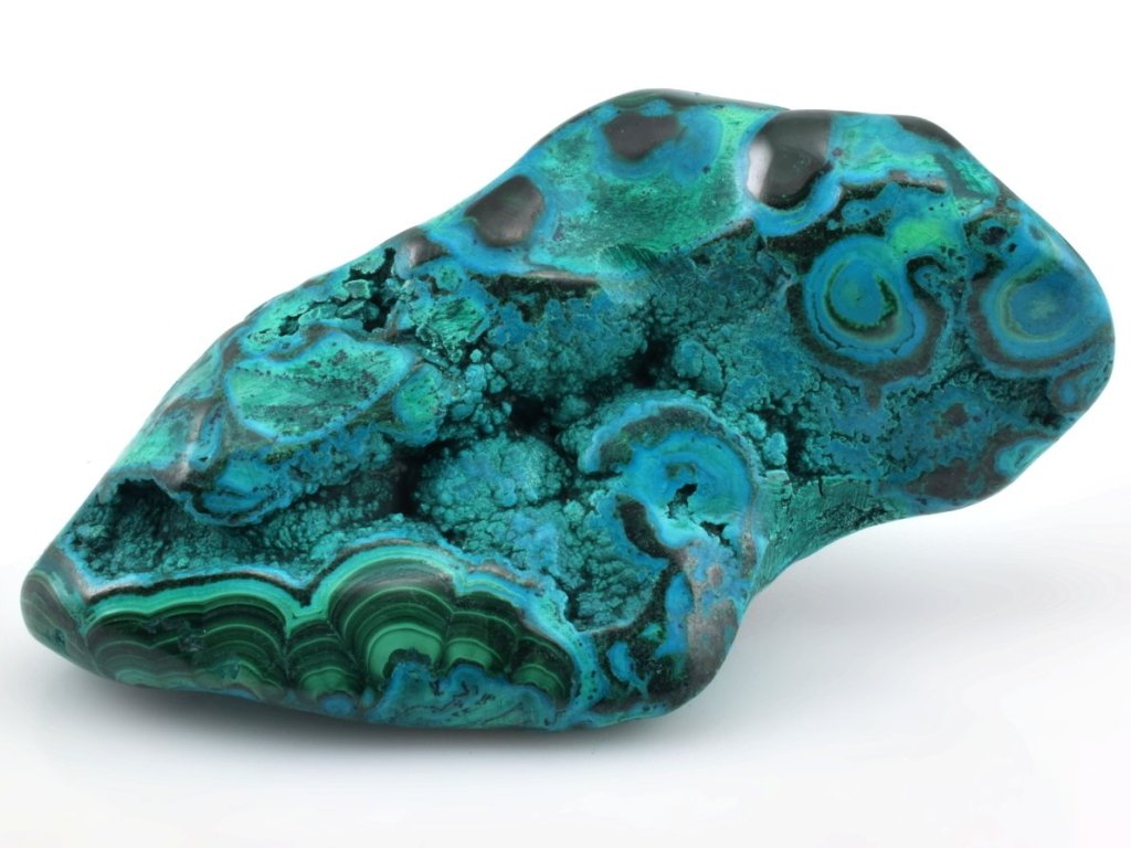 Jedinečný leštěný vzorek chryzokolu a malachitu z proslulého naleziště u města Lubumbashi (DR Kongo), který zaujme na první pohled svou dramatickou hrou barev.