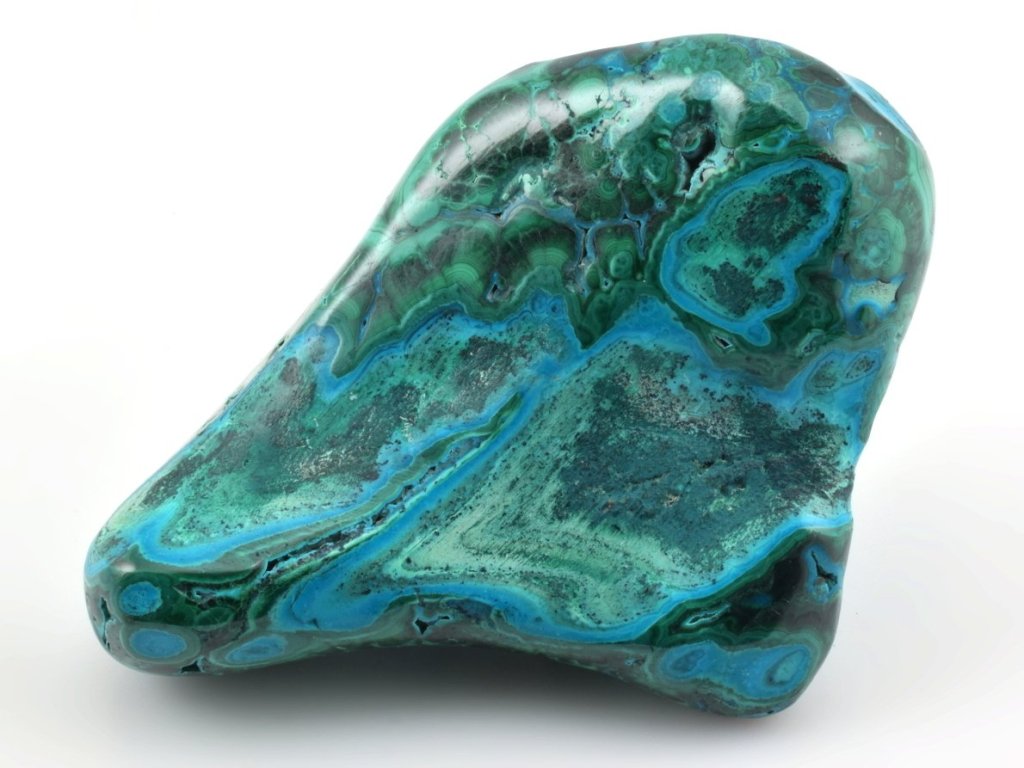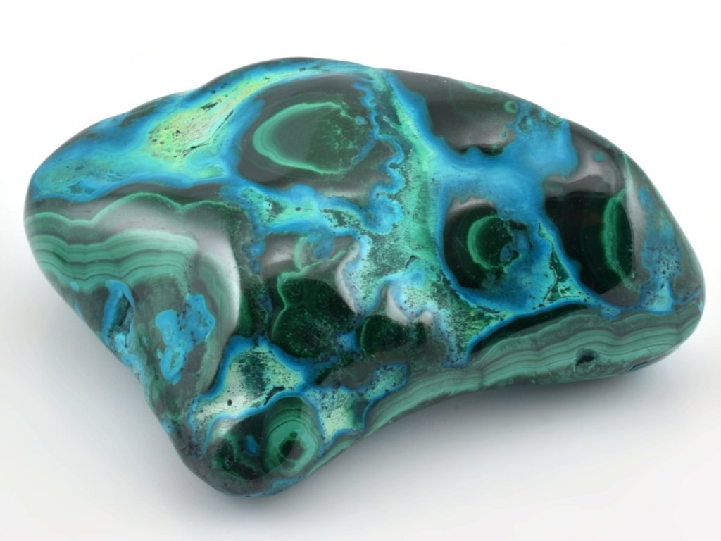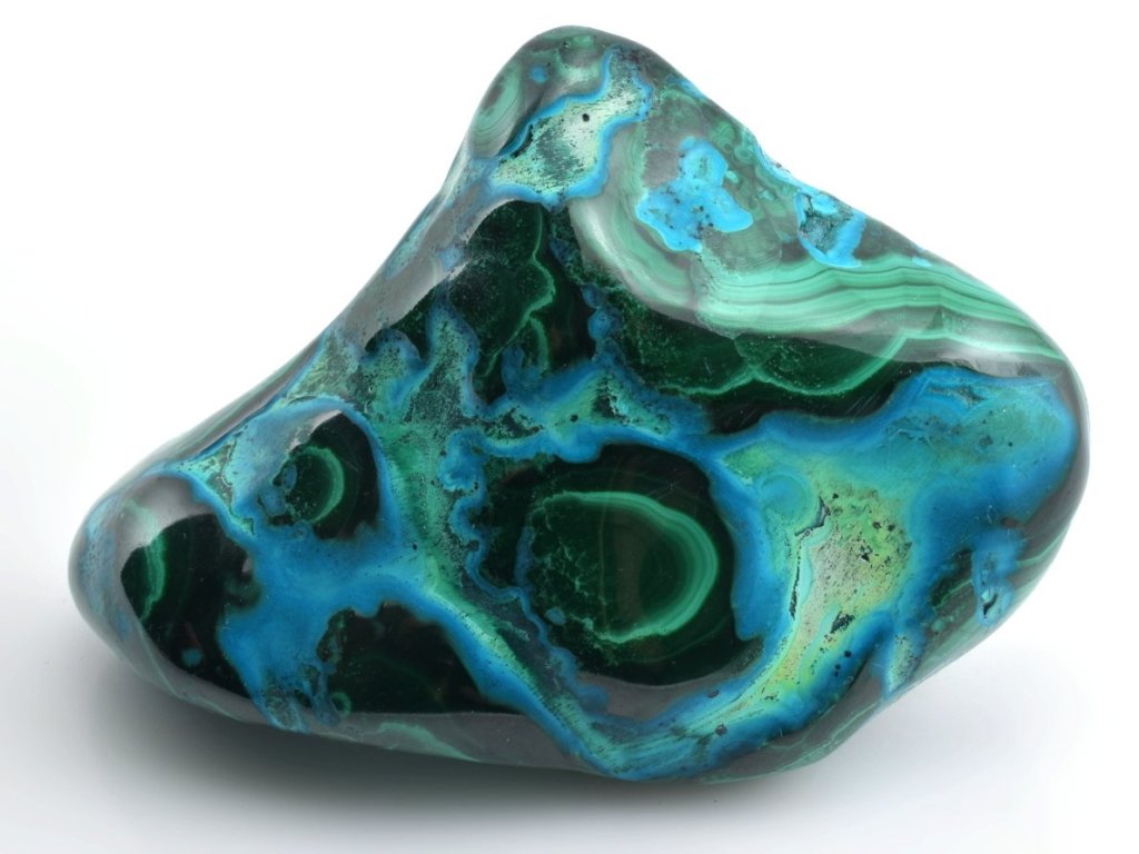 Jedinečný leštěný vzorek chryzokolu a malachitu z proslulého naleziště u města Lubumbashi (DR Kongo), který zaujme na první pohled svou dramatickou hrou barev.