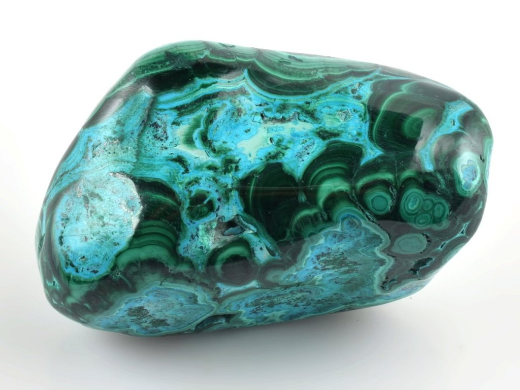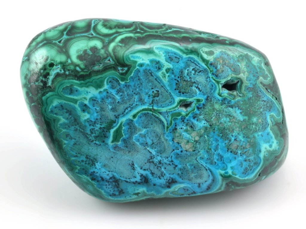 Jedinečný leštěný vzorek chryzokolu a malachitu z proslulého naleziště u města Lubumbashi (DR Kongo), který zaujme na první pohled svou dramatickou hrou barev.