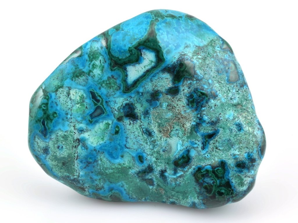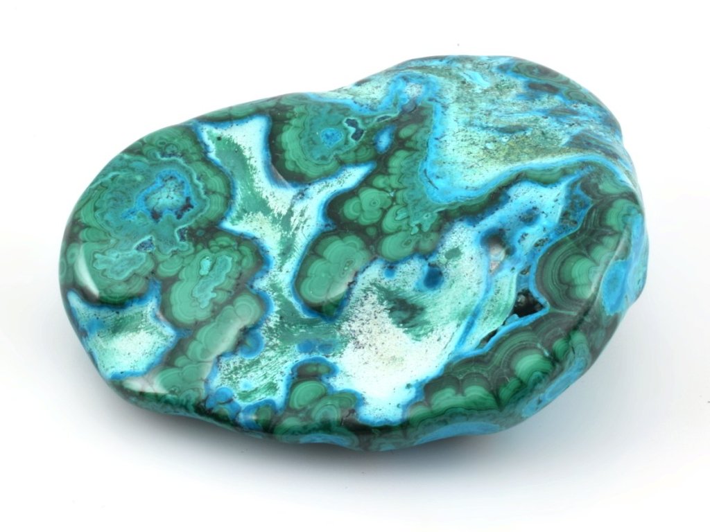 Jedinečný leštěný vzorek chryzokolu a malachitu z proslulého naleziště u města Lubumbashi (DR Kongo), který zaujme na první pohled svou dramatickou hrou barev.