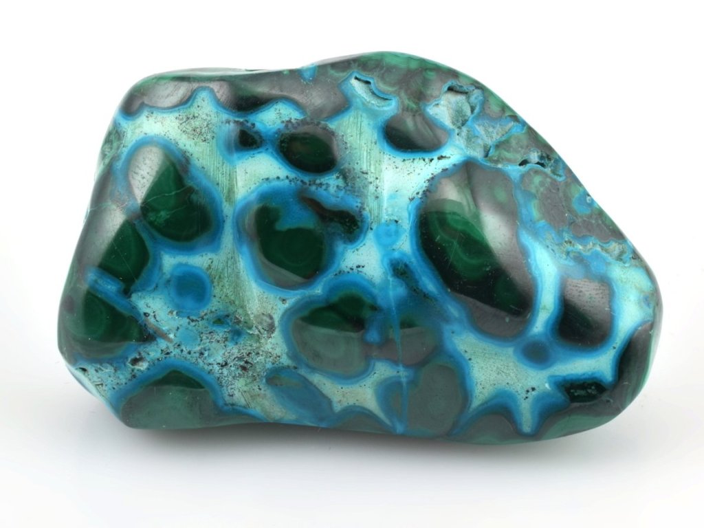 Jedinečný leštěný vzorek chryzokolu a malachitu z proslulého naleziště u města Lubumbashi (DR Kongo), který zaujme na první pohled svou dramatickou hrou barev.