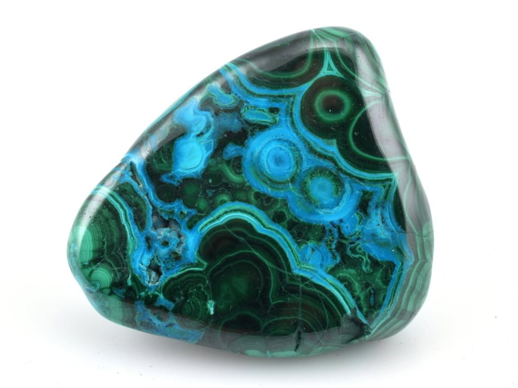 Jedinečný leštěný vzorek chryzokolu a malachitu z proslulého naleziště u města Lubumbashi (DR Kongo), který zaujme na první pohled svou dramatickou hrou barev.
