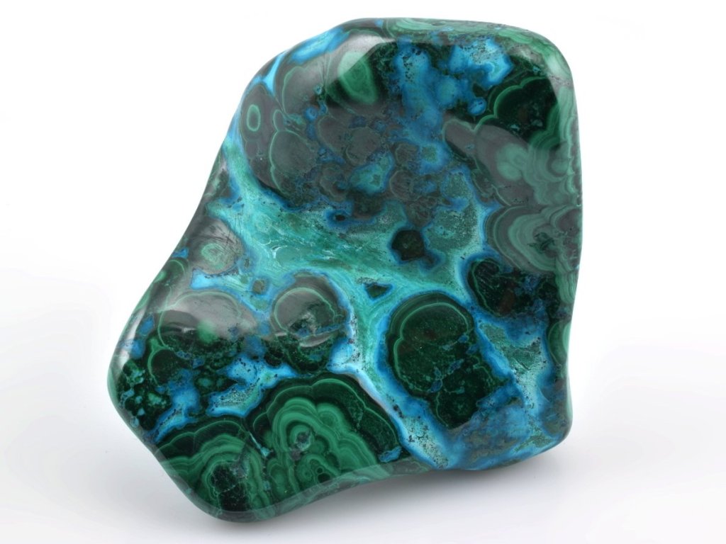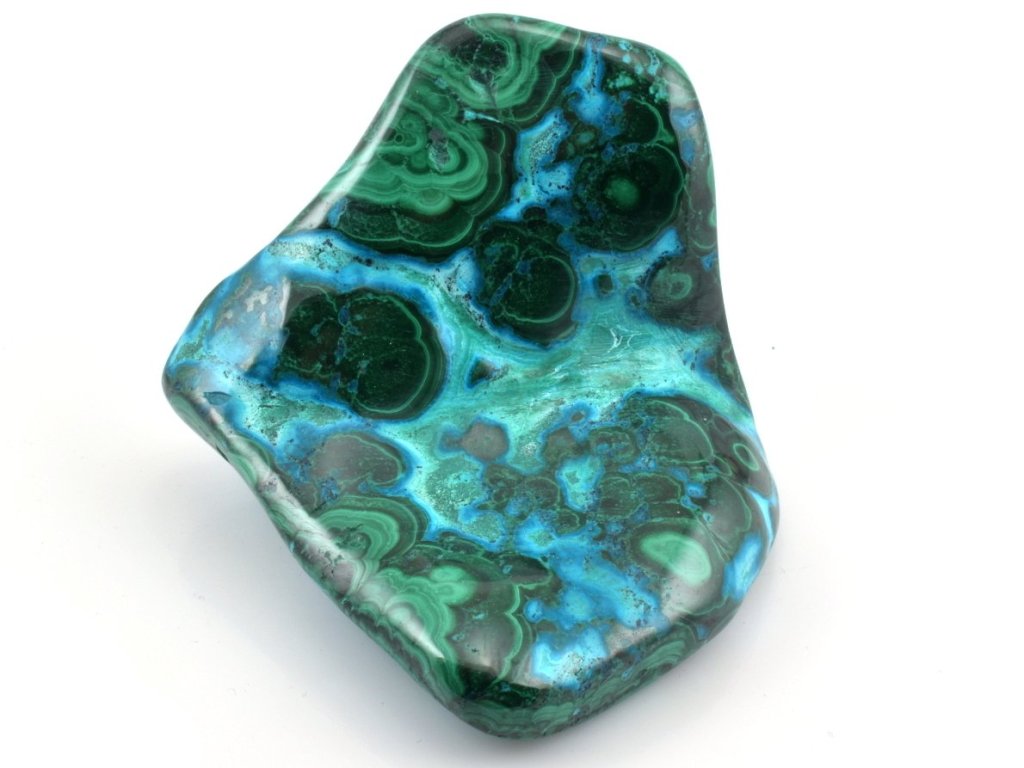 Jedinečný leštěný vzorek chryzokolu a malachitu z proslulého naleziště u města Lubumbashi (DR Kongo), který zaujme na první pohled svou dramatickou hrou barev.