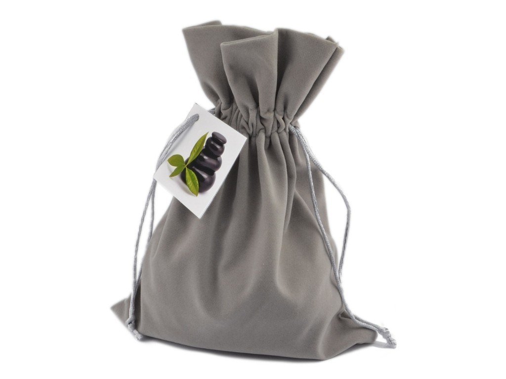 Kameny jsou uloženy v sametovém sáčku šedé barvy.