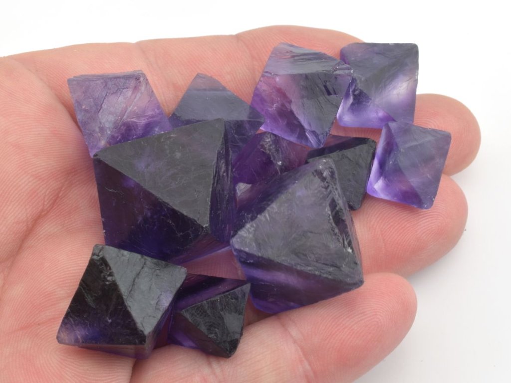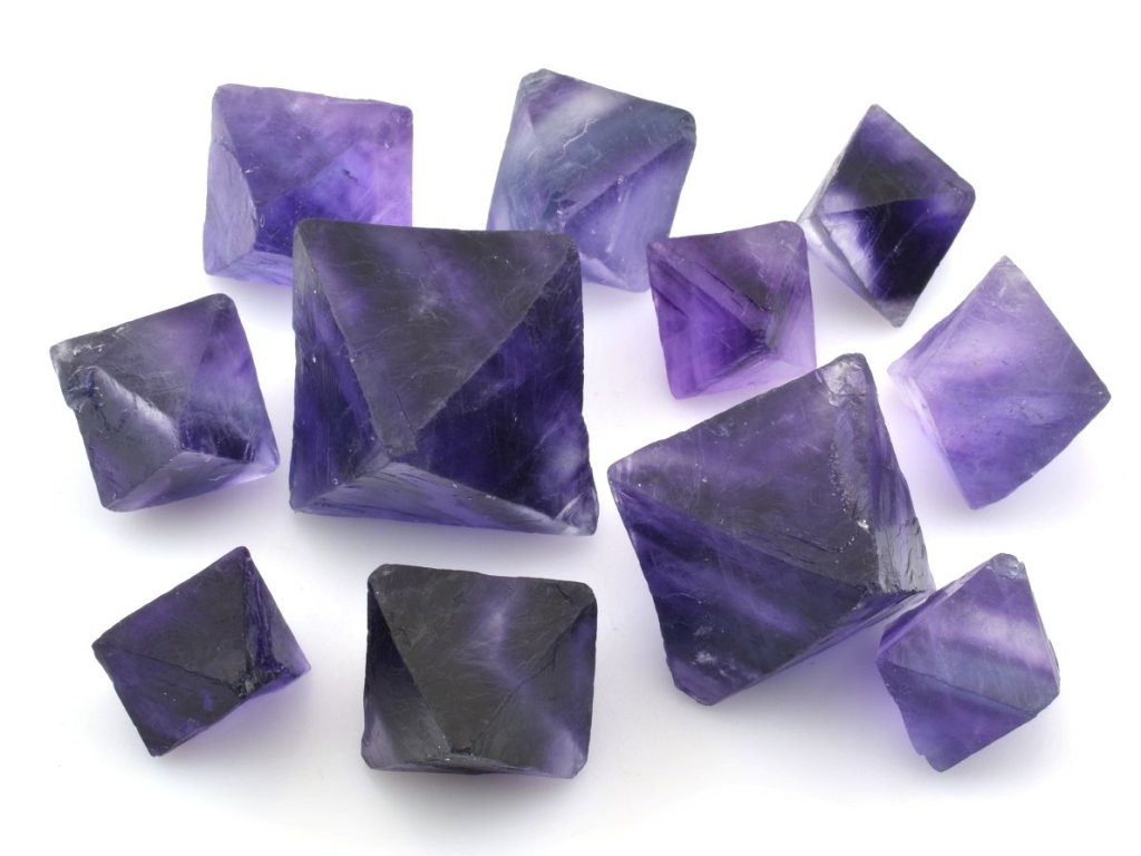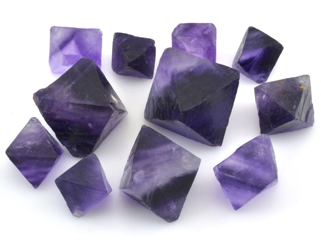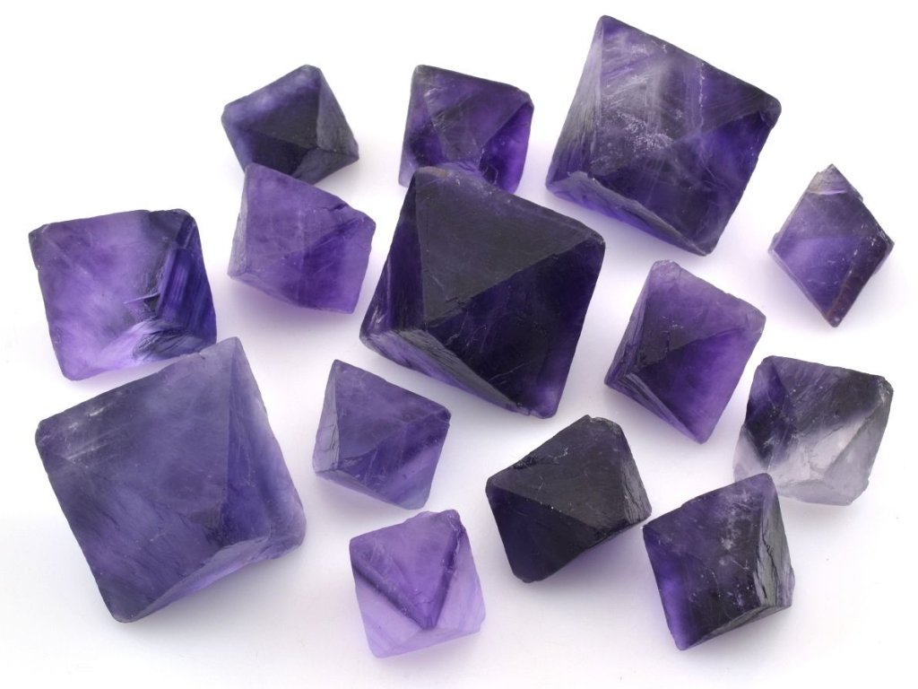 Krystaly fluoritu v naší nabídce mají sytou fialovou barvou a některé mají výrazné zonální rozložením barev a vykazují tak výrazné kontrastní přechody mezi jednotlivými odstíny. Zonálnost u fluoritu je způsobena změnami v chemickém složení během vzniku minerálu. V naší nabídce se jedná o fialové sekané osmistěnné krystaly pocházející z Číny. Fialová barva a zonálnost vynikne nejlépe při jasném světle.