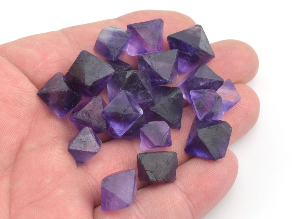 Fialové krystaly fluoritu jsou ve formě osmistěnů (oktaedrů) o velikosti 1–2 cm. U některých krystalů lze pozorovat zonální rozložení barev, což znamená, že barvy jsou rozvrstvené do jasně viditelných pásem. Tyto přechody mohou být velmi výrazné, jak je vidět u některých krystalů na fotografii. Fialová barva vynikne nejlépe při jasném světle.
