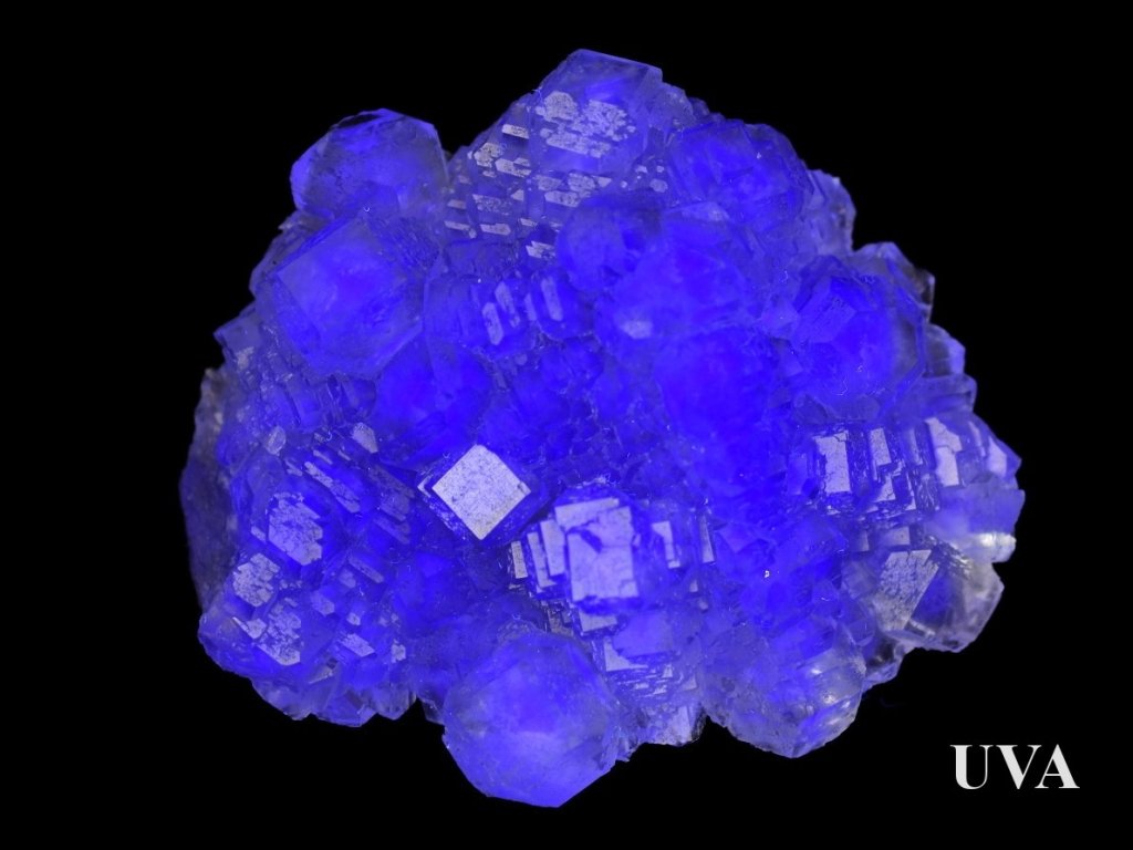 Pokud chcete fluorescenci na drúze fluoritu vidět, je nezbytné použít UVA svítilnu. Více informací o UV minerálech najdete v článku "Fluorescenční minerály".