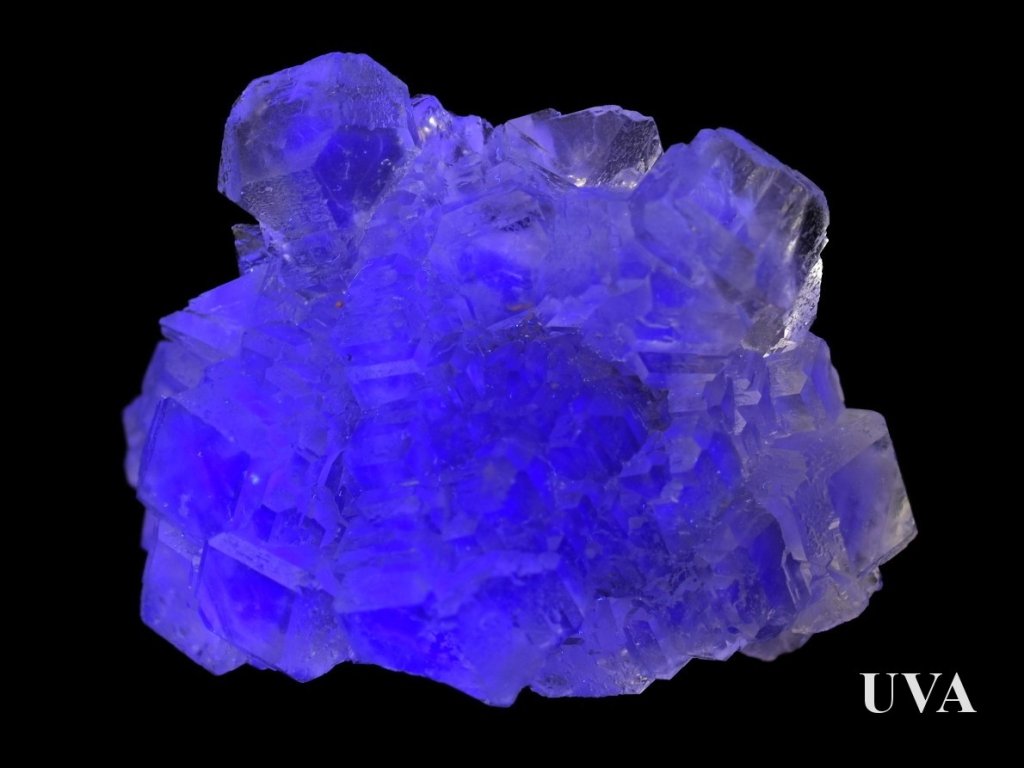 Pokud chcete fluorescenci na drúze fluoritu vidět, je nezbytné použít UVA svítilnu. Více informací o UV minerálech najdete v článku "Fluorescenční minerály".