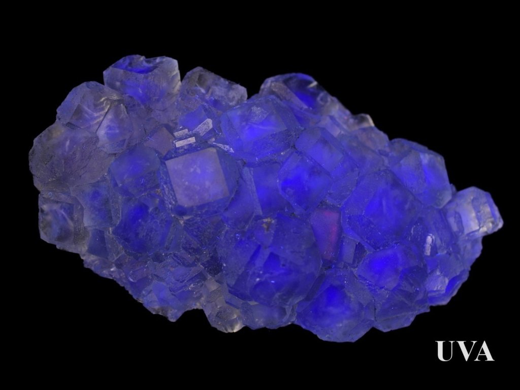 Pokud chcete fluorescenci na drúze fluoritu vidět, je nezbytné použít UVA svítilnu. Více informací o UV minerálech najdete v článku "Fluorescenční minerály".