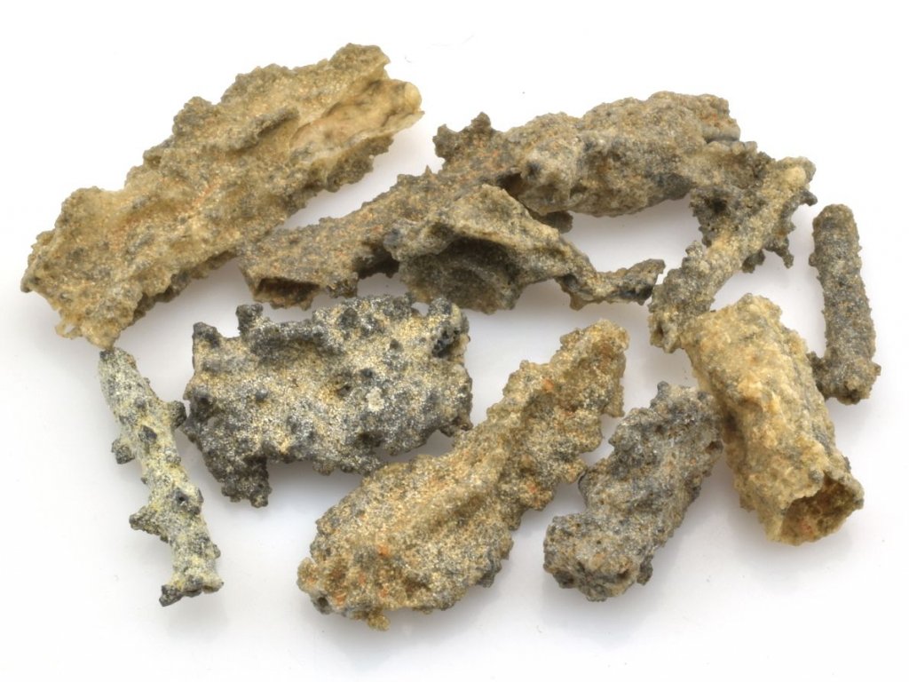 Balení několika kusů fulguritů o celkové hmotnosti 10 g. Jedná se o mix různých tvarů a velikostí. Některé kusy mají středový kanálek vyvinutý, některé pouze jednostranně a zejména u plochých tvarů kanálek chybí.