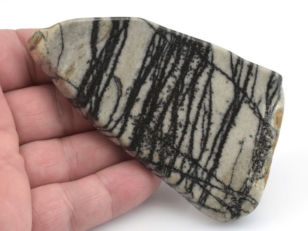 Silný kontrast mezi černými pruhy a světlým podkladem z tohoto jaspisu dělá atraktivní materiál a názornou ukázkou jeho rozmanitosti.