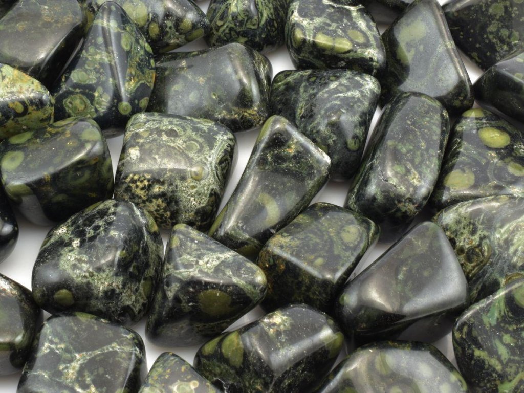 Tromlovaný eldarit (kambaba). Kambaba (také známý jako Jaspis kambaba) je nádherný drahý kámen pocházející z Madagaskaru, který okouzlí svými unikátními černými kruhy na zeleném pozadí.