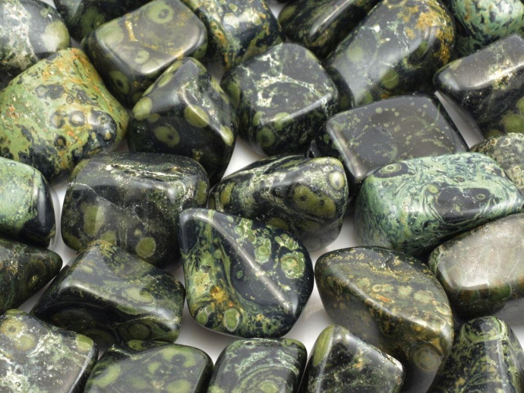 Tromlovaný eldarit (kambaba). Kambaba (také známý jako Jaspis kambaba) je nádherný drahý kámen pocházející z Madagaskaru, který okouzlí svými unikátními černými kruhy na zeleném pozadí.