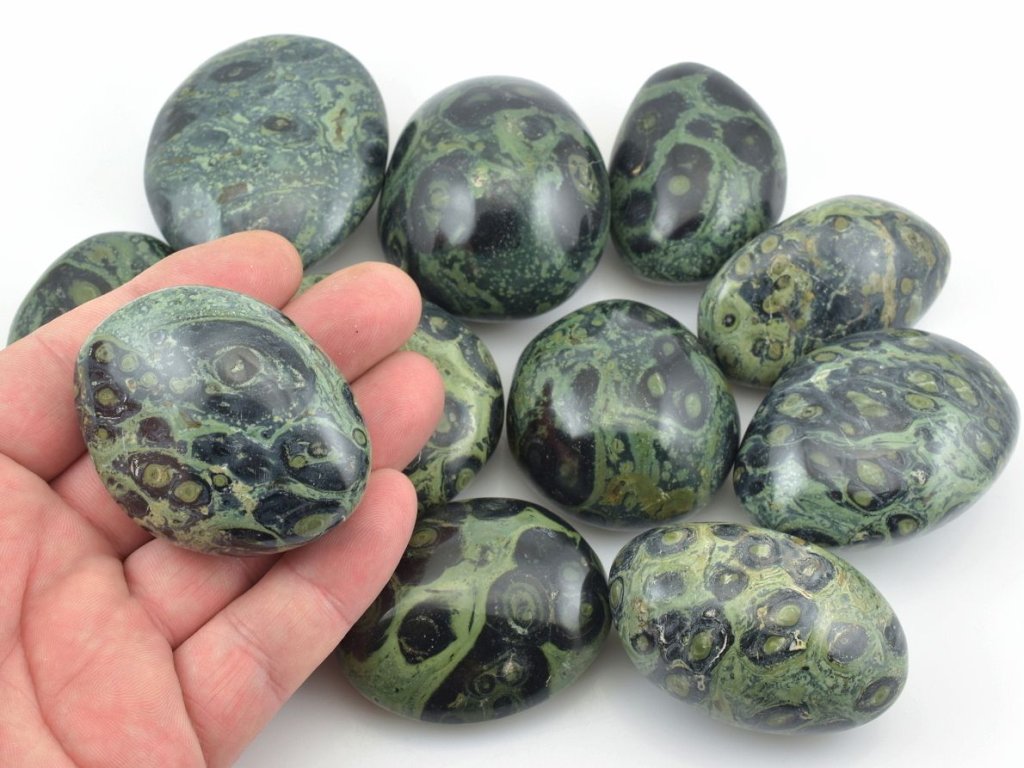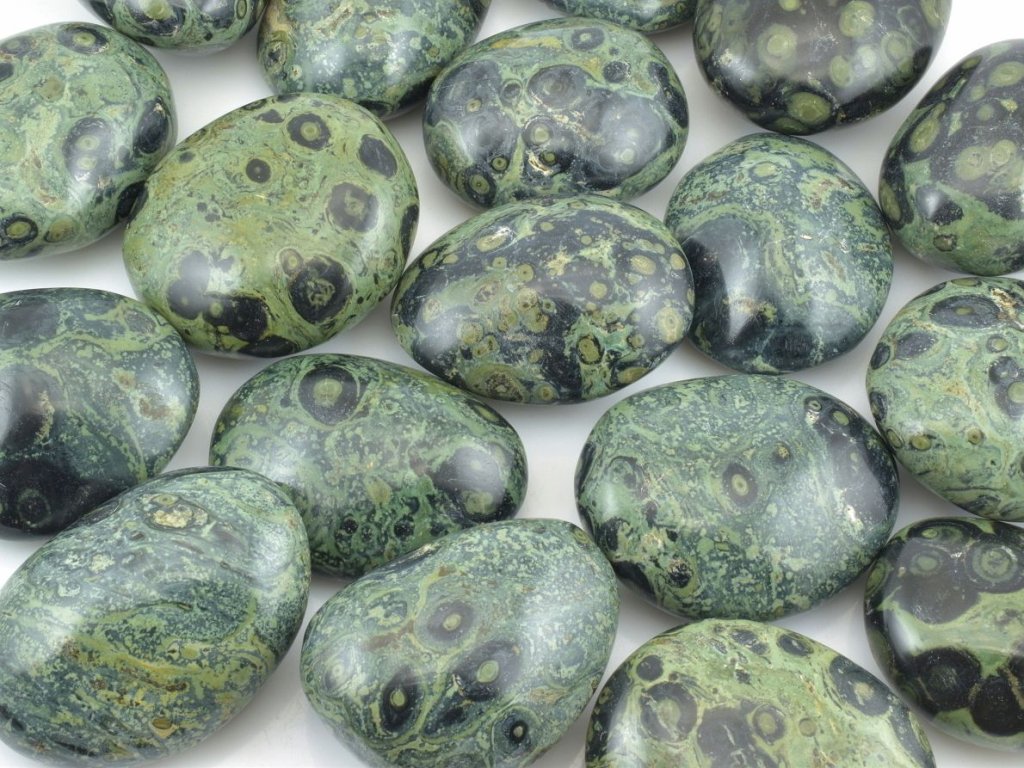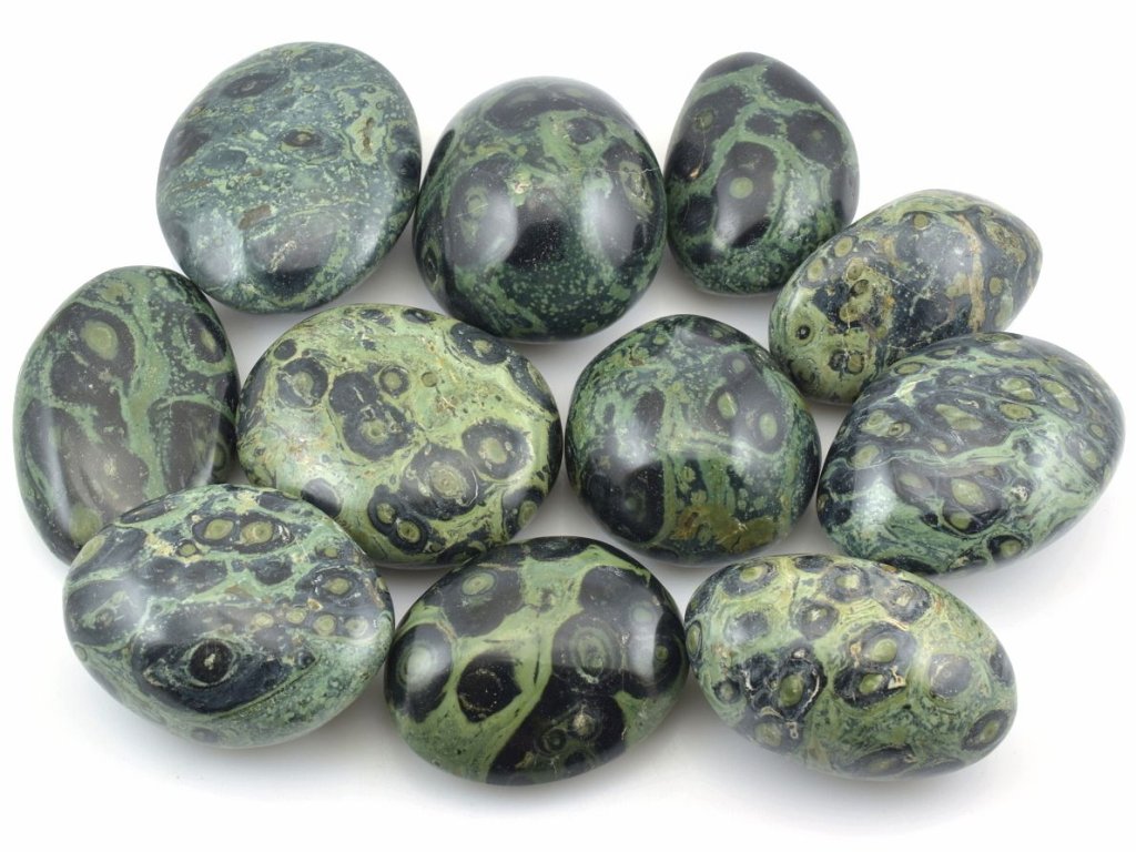 Nabízíme velké tromlované kameny kambaby, často označované také jako "jaspis kambaba", o velikosti přibližně 4–5 cm. Tento oblíbený druh vulkanické horniny pochází z Madagaskaru a je charakteristický černými kruhy na zeleném podkladu. Odborně se těmto kamenům říká eldarit.