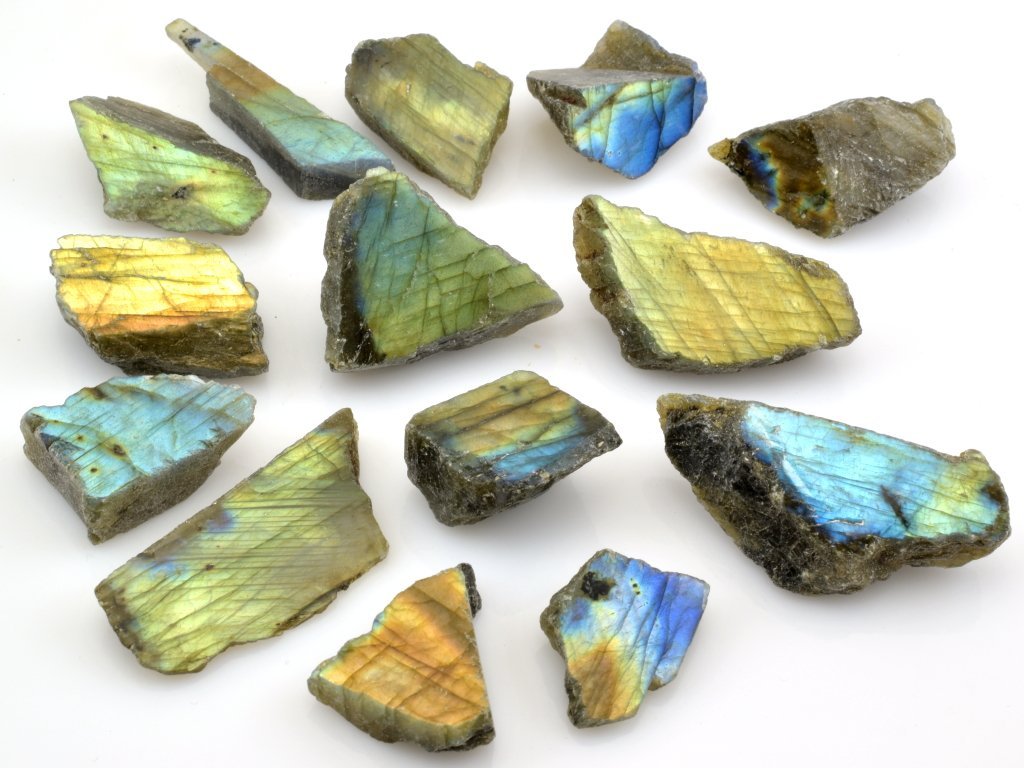 Labradorit je typický svým krásným odleskem a hrou barev. Duhový odlesk kamenů je vidět pod určitým úhlem, kameny na fotografii jsou natočeny tak, aby byl efekt viditelný.