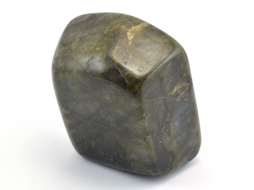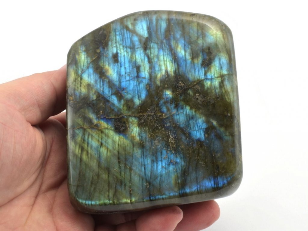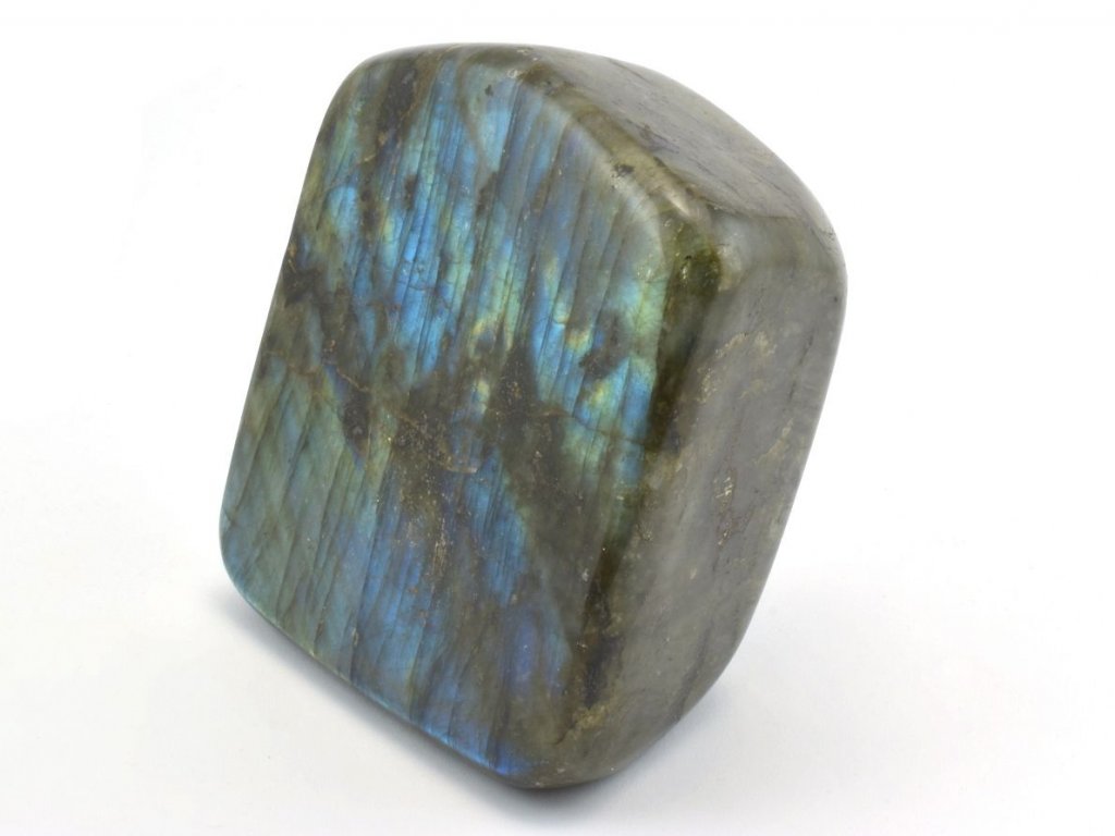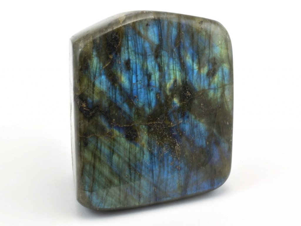 Výběrový, celoleštěný a samostatně stojící kus labradoritu.