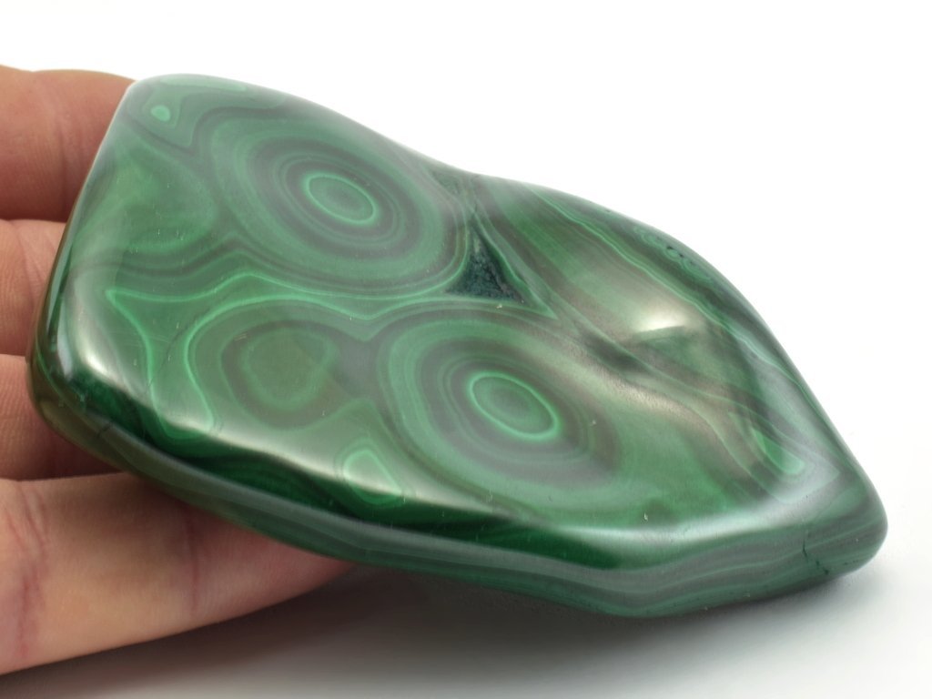 Výběrový leštěný malachit s jedinečnou kresbou a přírodní strukturou. Tento kus pochází z Demokratické republiky Kongo, kde se dnes nacházejí jedny z nejbohatších nalezišť malachitu na světě. Tyto leštěné "free form" kusy jsou pečlivě opracovány tak, aby se zachovalo co nejvíce hmoty minerálu, a současně vynikly charakteristické kruhové a vrstevnaté vzory v různých odstínech zelené.