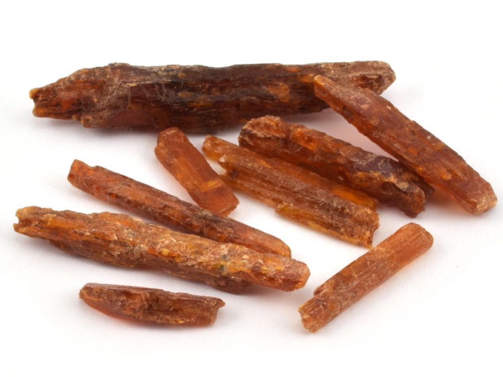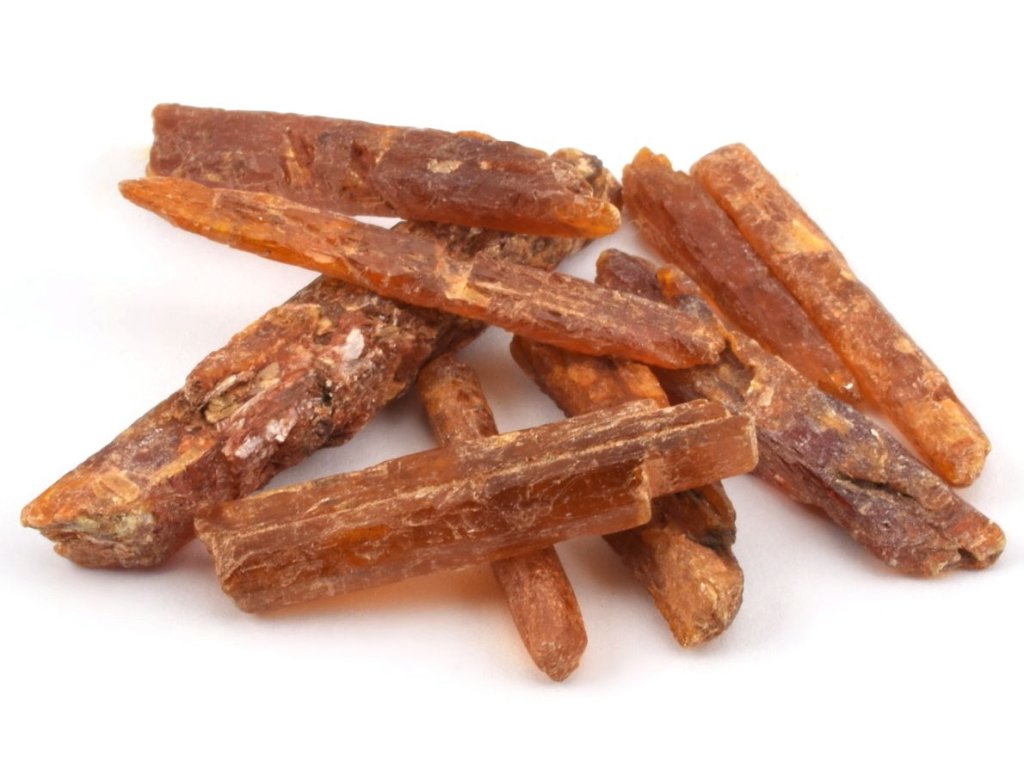 Přirozené, neopracované krystaly kyanitu, s typickou oranžovou barvou.