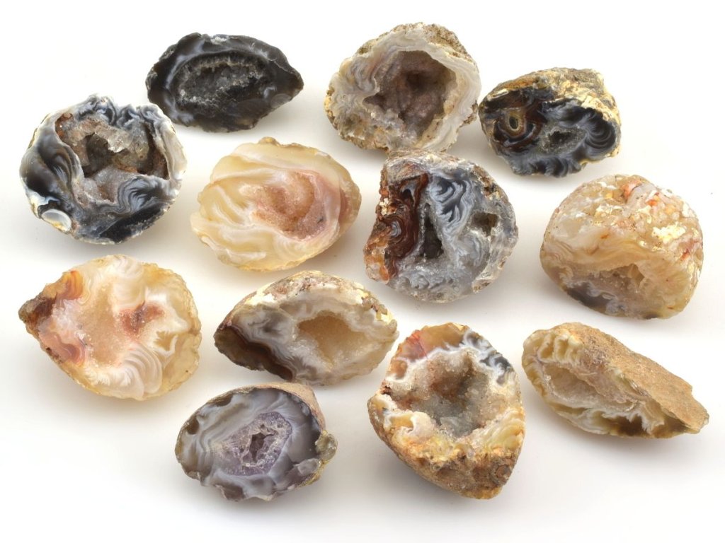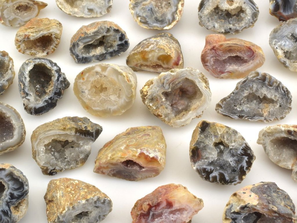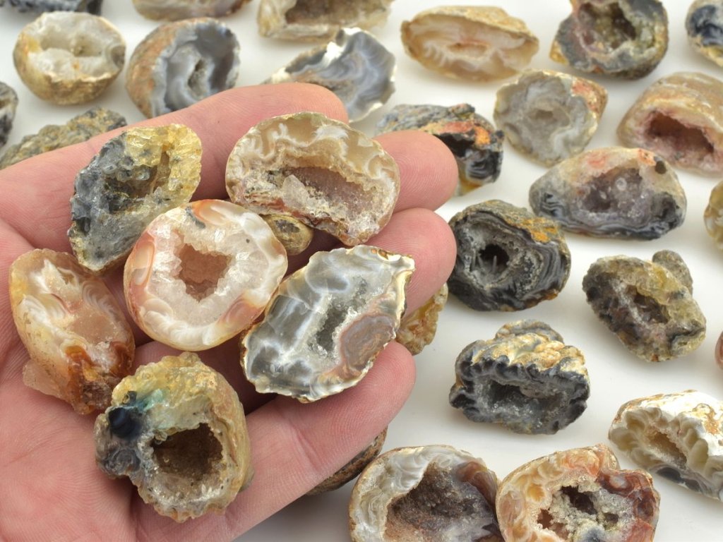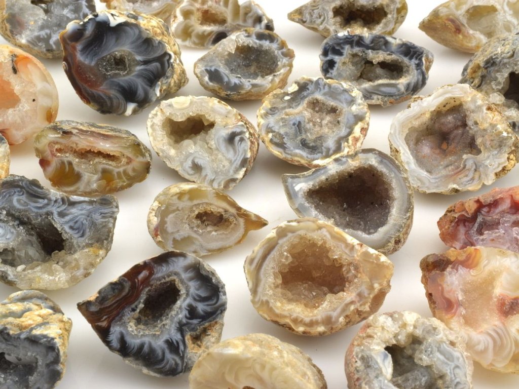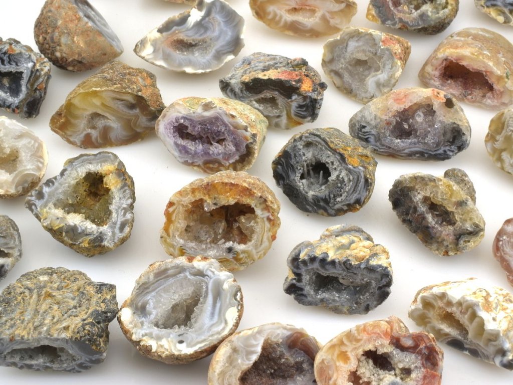 Mini geodky peříčkového achátu z Brazílie jsou malé, jednostranně leštěné kousky přírodního achátu s typickými jemnými vzory připomínajícími peří nebo krajku. Tyto geodky mají velikost mezi 2,5 a 3 cm a každá z nich je jedinečná svou kombinací barev, které mohou zahrnovat černou, červenou, žlutou, hnědou, bílou nebo fialovou. Vzory peříčkového achátu vznikají postupným ukládáním minerálů ve vrstvách během milionů let.