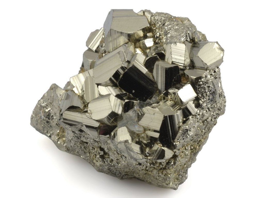 Zrcadlově lesklé krystaly pyritu z peruánského dolu Huanzala.