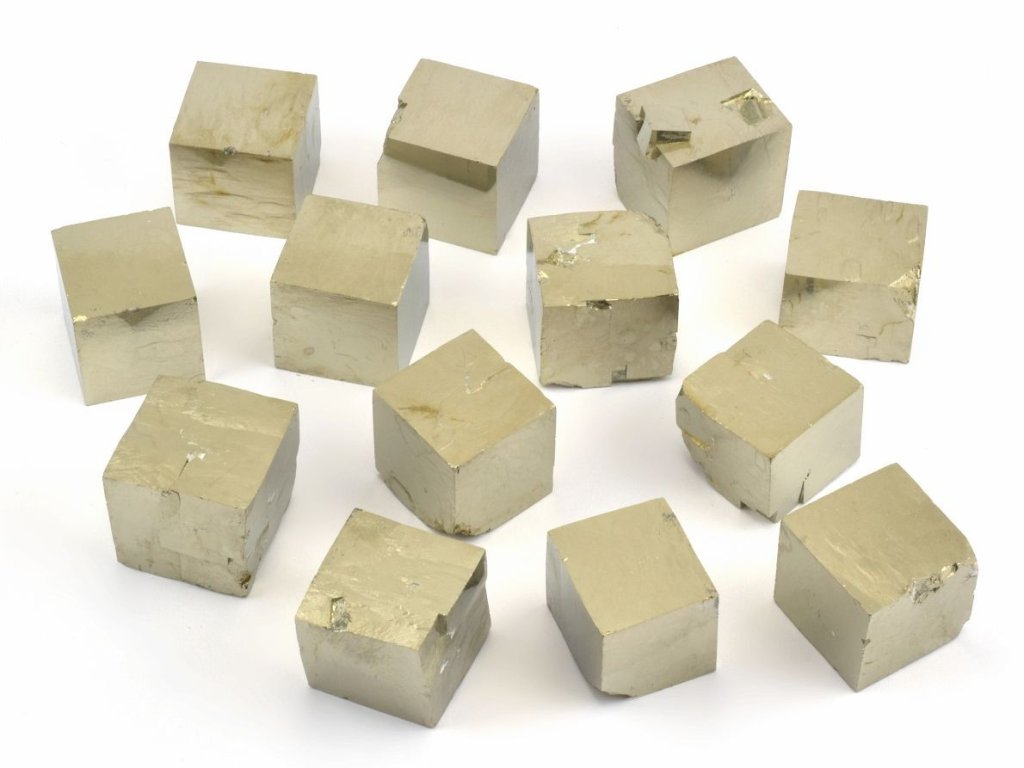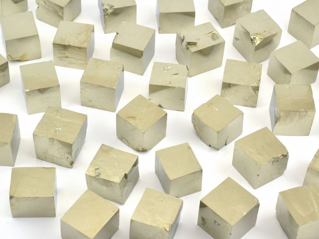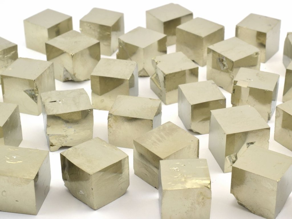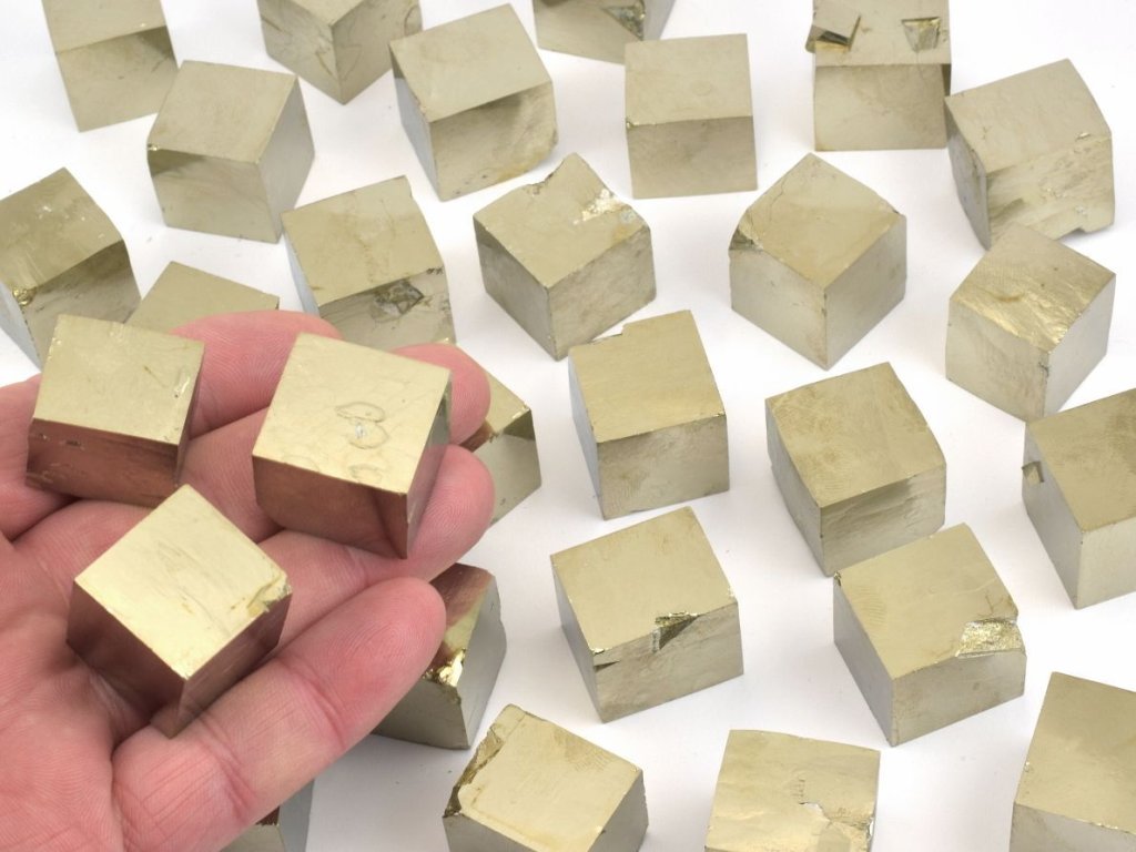 Nabízené kostky pyritu mají rozměry stran mezi 2 a 2,5 cm a jejich hmotnost se pohybuje v rozmezí 40 - 50 g. Většina hran a vrcholů u krystalů je v bezvadném stavu. Povrch krystalů je velmi lesklý. Jedná o krystaly dobré kvality. Kvalitu krystalů si můžete prohlédnout na videu níže.