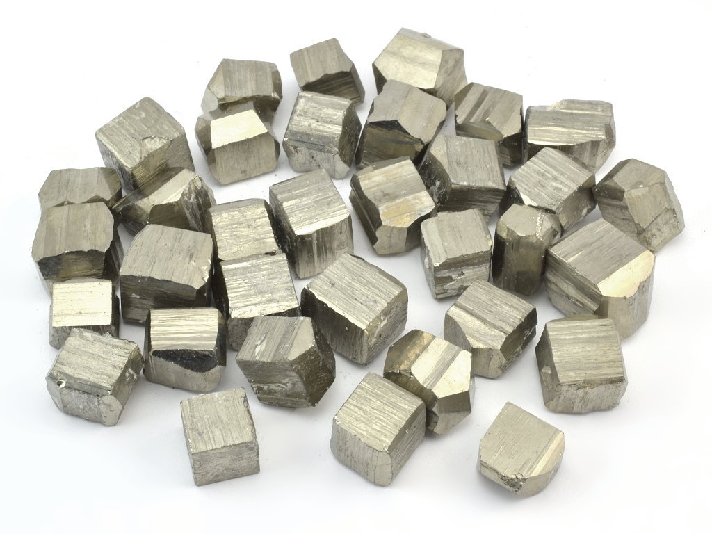 Pyrit, často nazývaný bláznovo zlato kvůli své zlatavé barvě, je důležitou železnou rudou. Někdy má zelenavý nádech nebo kovově modré, červené a zelené povlaky. Název pochází z řečtiny a znamená oheň, protože po úderu často jiskří. Chemicky je pyrit disulfid železnatý, má černý vryp a není kujný.
