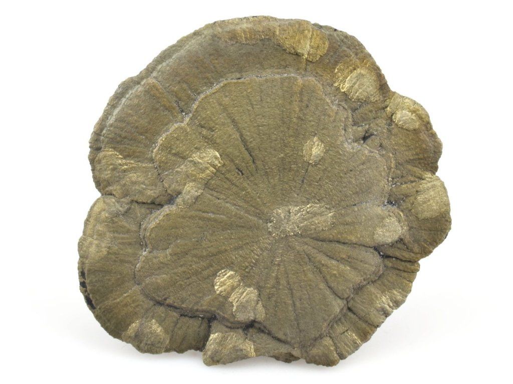 Tento konkrétní kus pyritového slunce je kompletní po celém obvodu. Typický radiální (paprsčitý) vzhled vytváří atraktivní strukturu s jemným kovovým leskem a třpytivými odlesky.