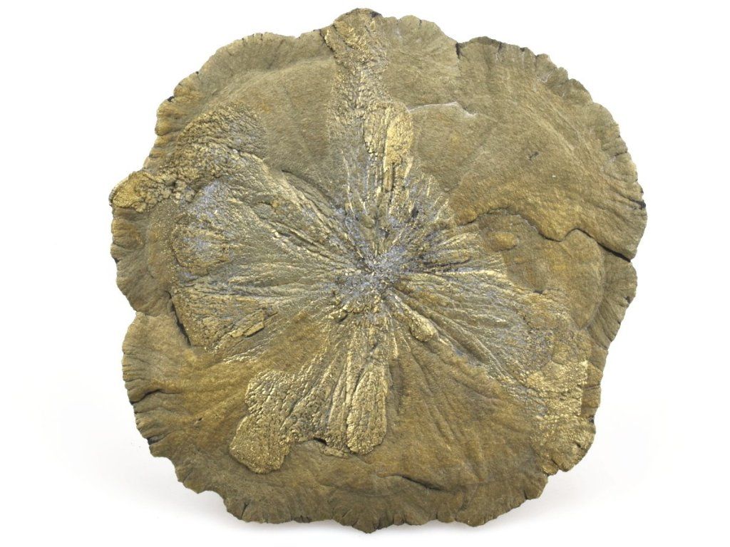 Tento konkrétní kus pyritového slunce je kompletní po celém obvodu. Typický radiální (paprsčitý) vzhled vytváří atraktivní strukturu s jemným kovovým leskem a třpytivými odlesky.
