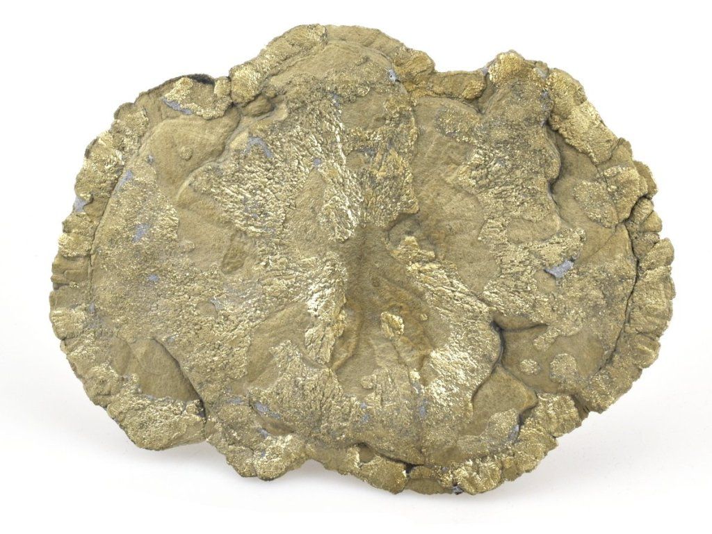 Tento konkrétní kus pyritového slunce je kompletní po celém obvodu. Typický radiální (paprsčitý) vzhled vytváří atraktivní strukturu s jemným kovovým leskem a třpytivými odlesky.