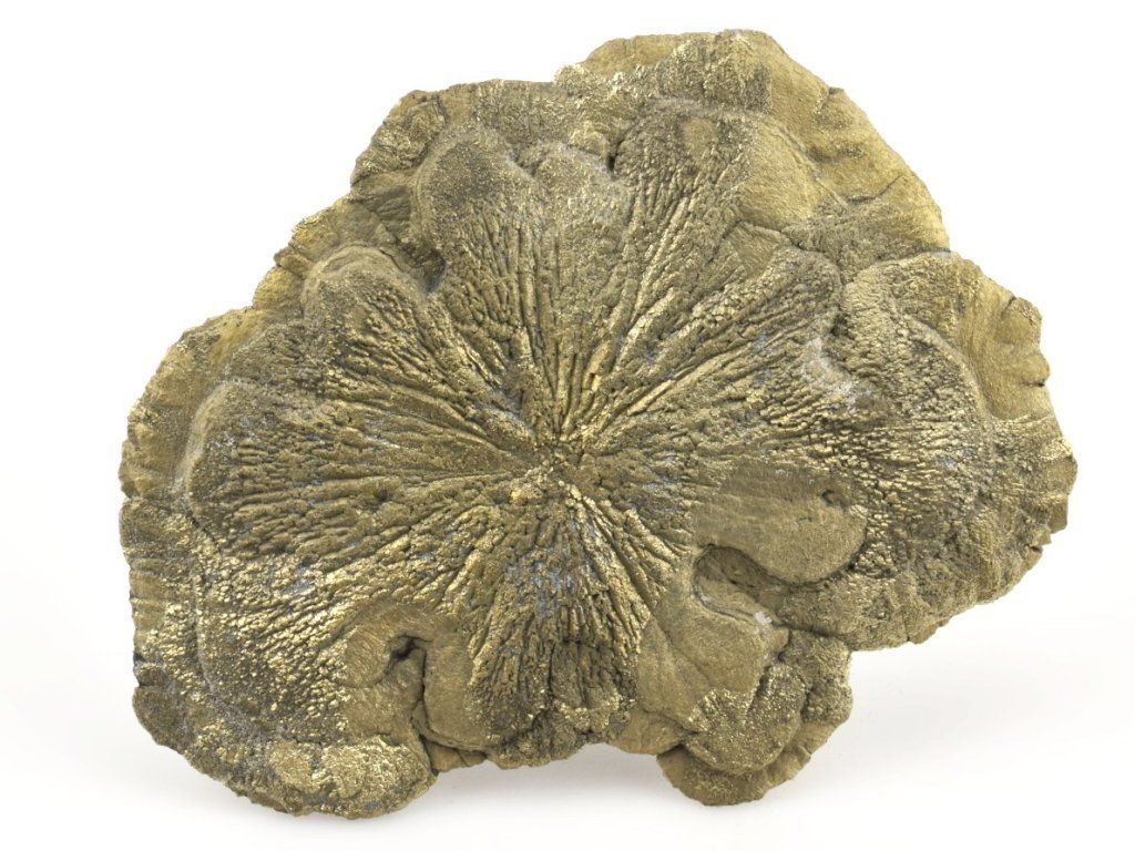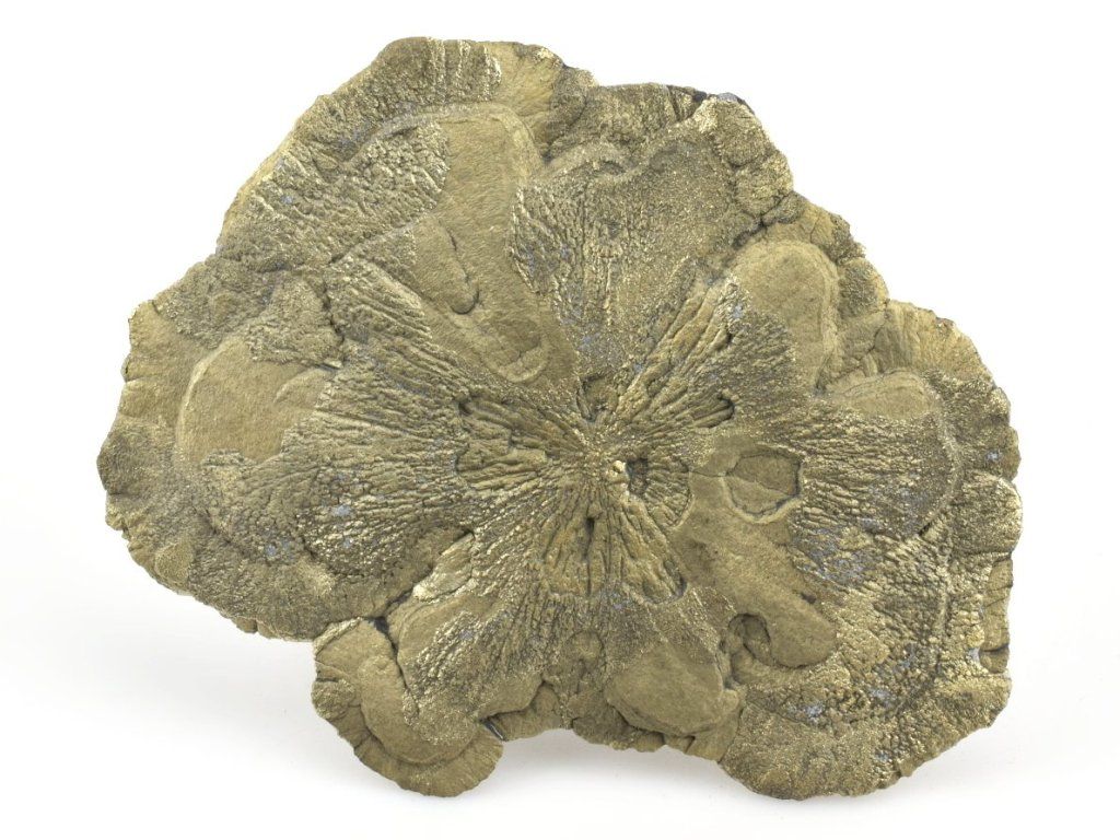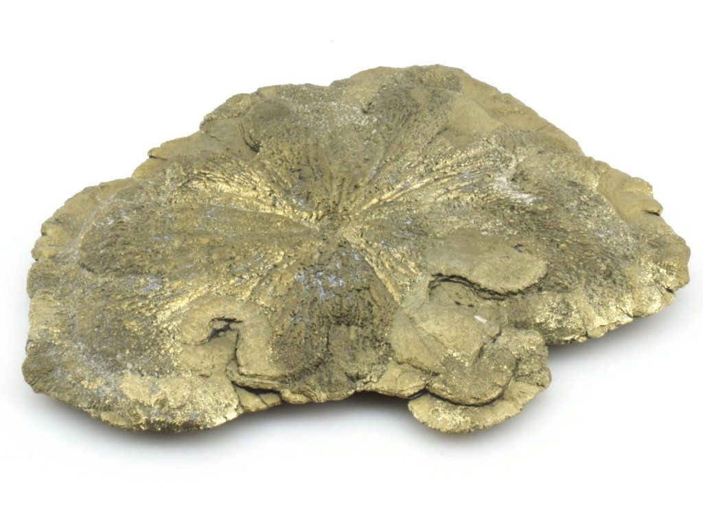 Tento konkrétní kus pyritového slunce je kompletní po celém obvodu. Typický radiální (paprsčitý) vzhled vytváří atraktivní strukturu s jemným kovovým leskem a třpytivými odlesky.