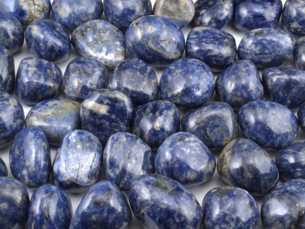 Tromlovaný sodalit s červenou fluorescencí pod UV světlem. Na denním světle má typickou modrou barvu, ale po nasvícení UV lampou se rozzáří červenými odstíny.