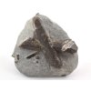 Zdvojčatělé krystaly staurolitu srůstající pod úhlem 60-ti stupňů zarostlé v třpytivé slídnaté rule.