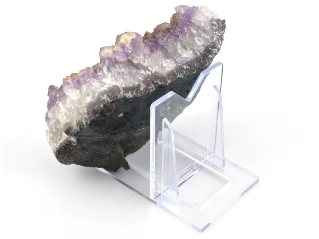 Praktický a stabilní stojánek z čirého pevného plastu, určený pro vystavení větších achátových plátků a dalších nerostů.
