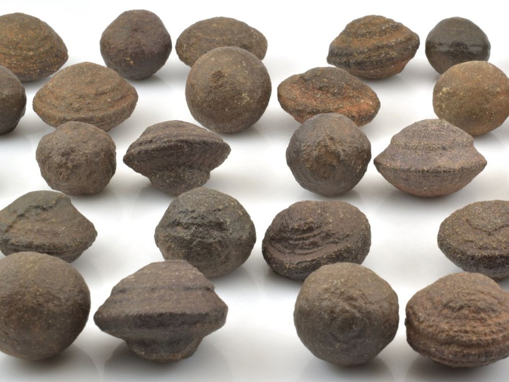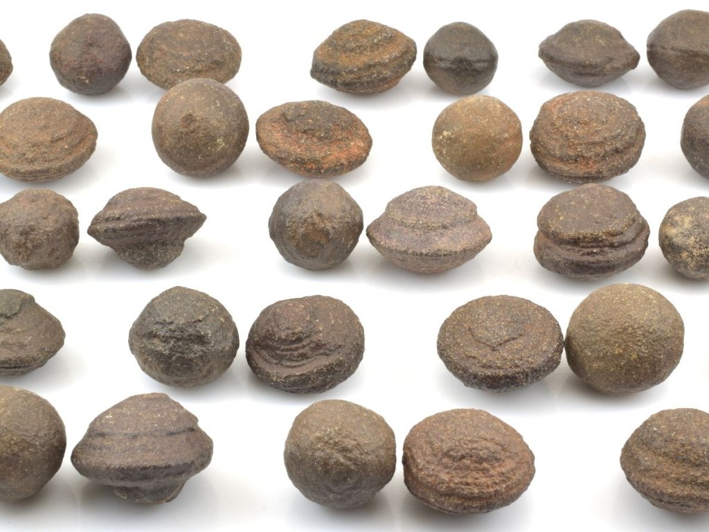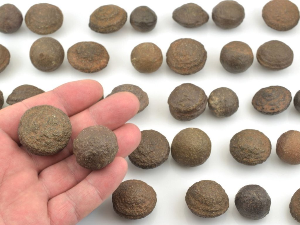 Na foto: Kuličky Moqui Marbles střední velikosti. Hmotnost páru se pohybuje mezi 25 až 40 g. Rozměry jednotlivých kamenů jsou mezi 2,0 až 3,0 cm.