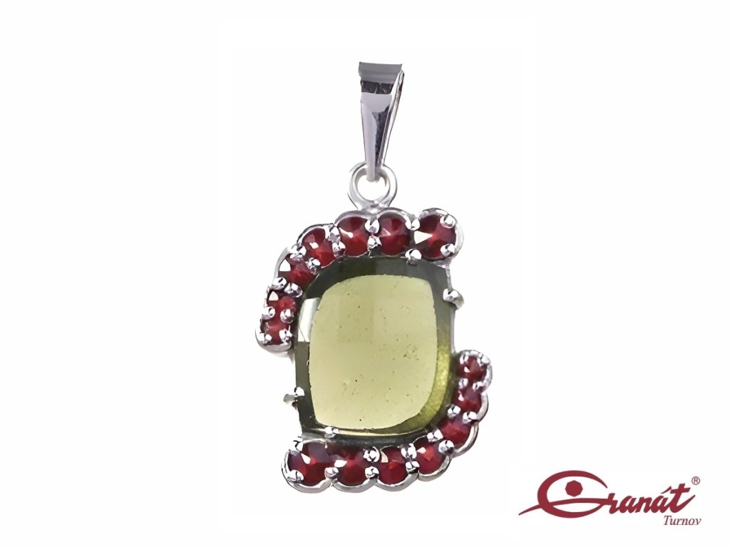Kombinace českého granátu a vltavínu dodává šperku jedinečný kontrast – granát září hlubokou červenou barvou, zatímco vltavín vyniká svou typickou zelení. Středovou část přívěsku tvoří vltavín.